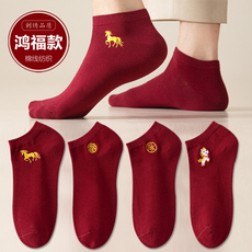 酒红色属马年船袜本命年男女一对喜字结婚情侣春夏薄款红袜子短袜
