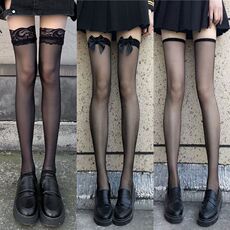 喵:纯欲撞色蝴蝶结大腿袜性感黑丝长筒蕾丝袜jk半截过膝袜子薄款