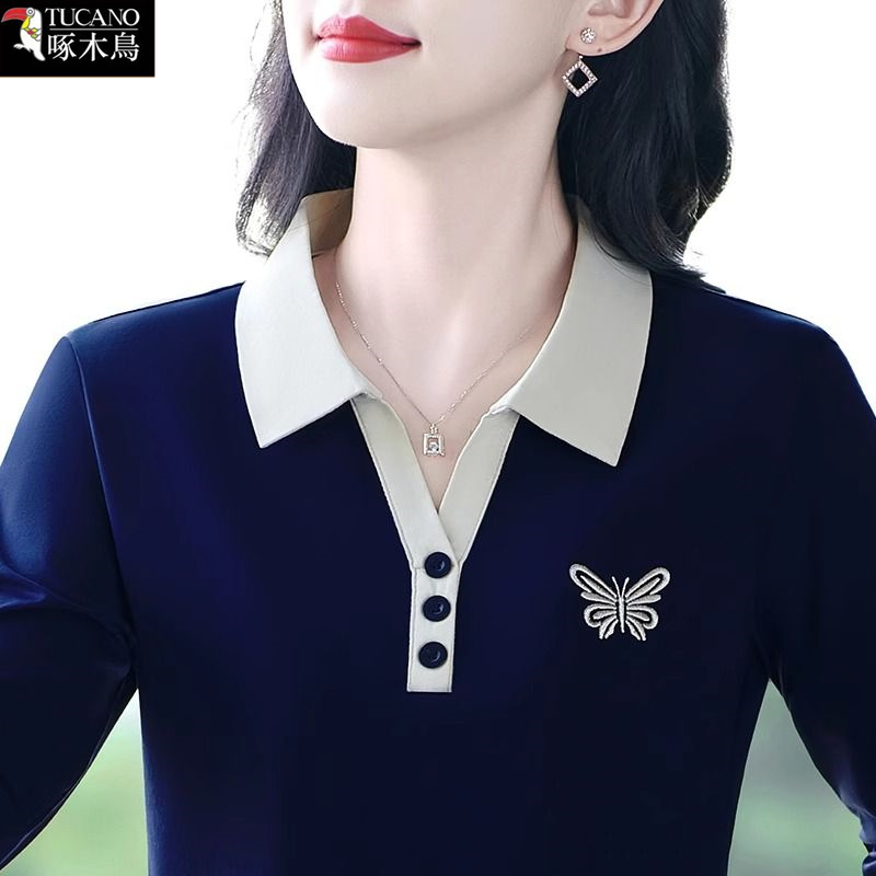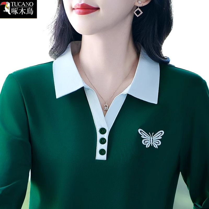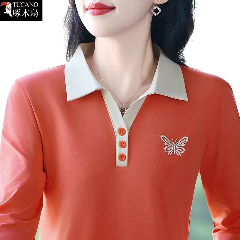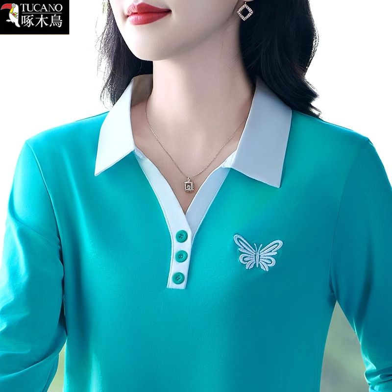啄木鸟2025年新款长袖翻领T恤女