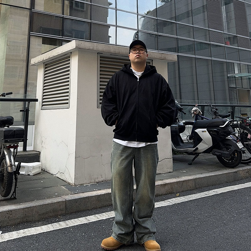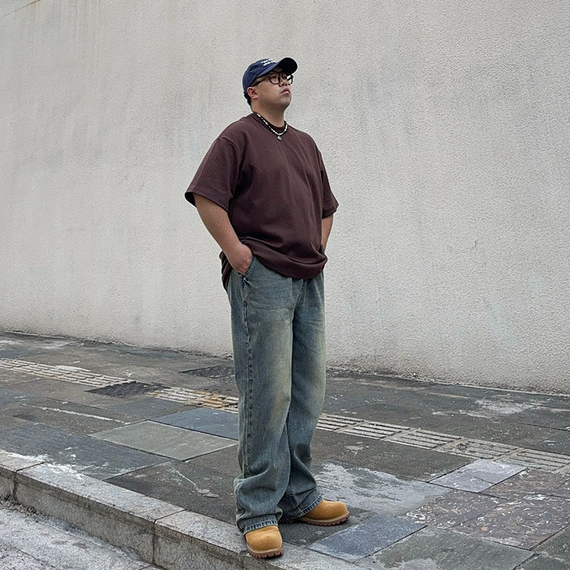oopsshop大码宽松直筒水洗基础牛仔裤男士街头高街胖子裤子百搭春