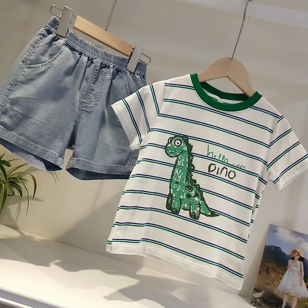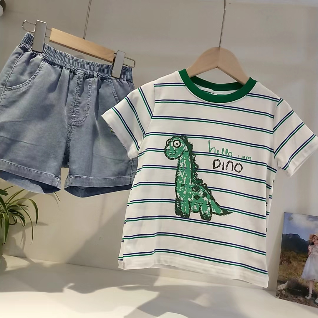 宝宝T恤新款夏季新款洋气小童短袖男童男孩条纹恐龙纯棉上衣半袖