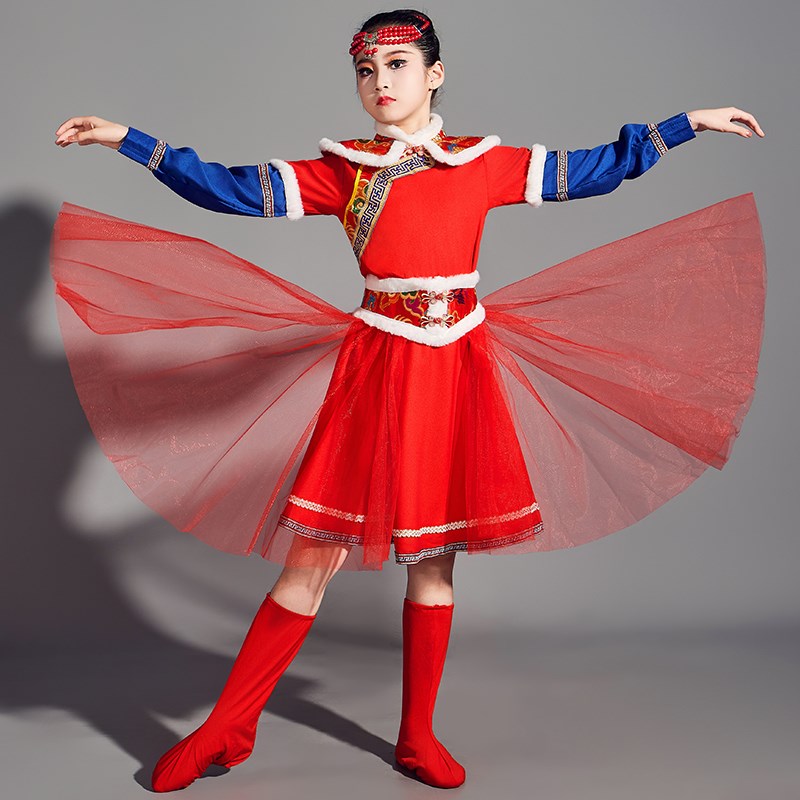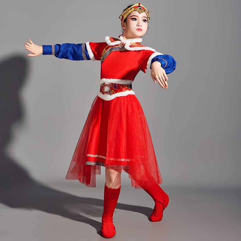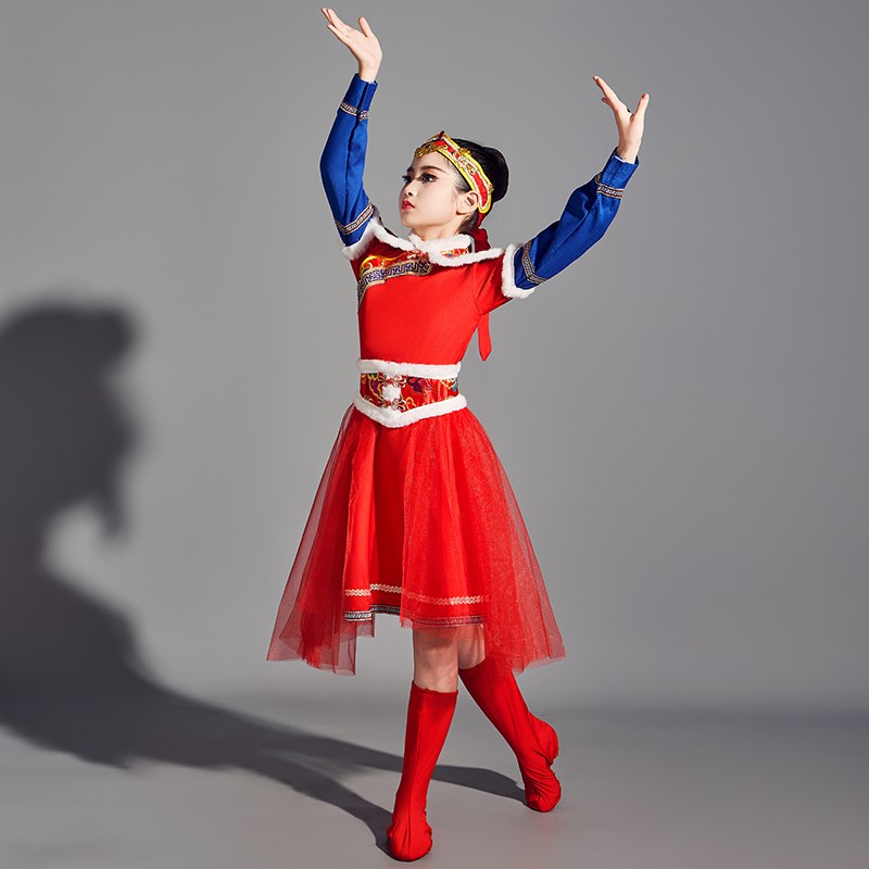 现货速发儿童蒙古服族舞蹈演出服蒙古族服装童筷子舞民族袍蒙族白