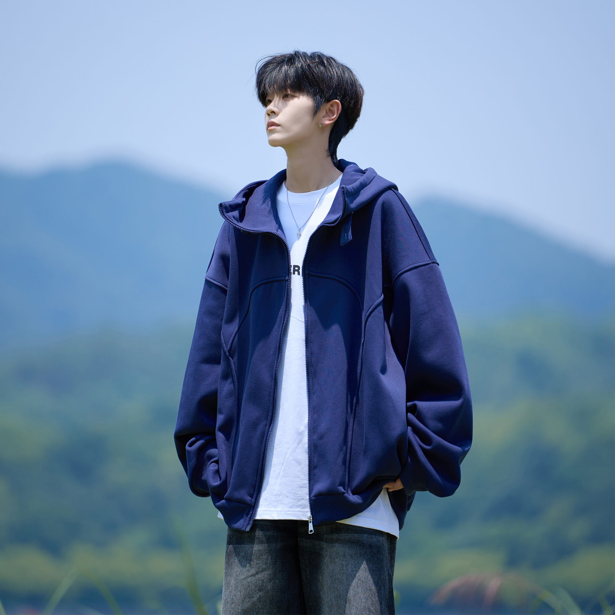 二更开衫连帽加绒卫衣男秋冬季2025新款美式潮流重磅男生宽松外套