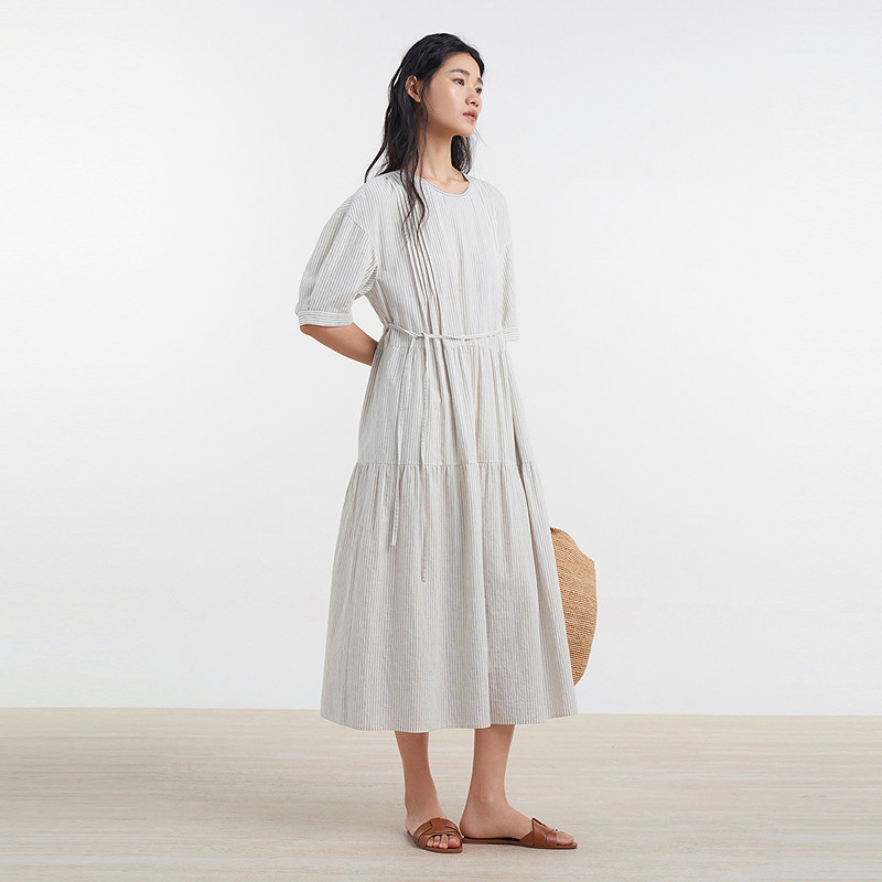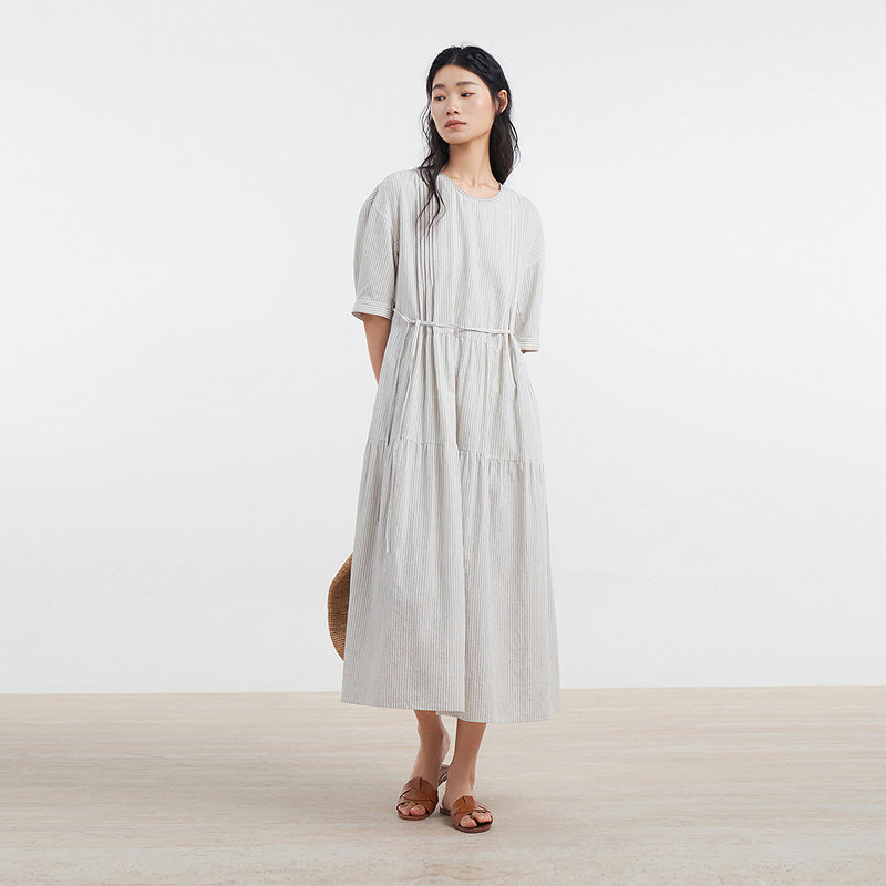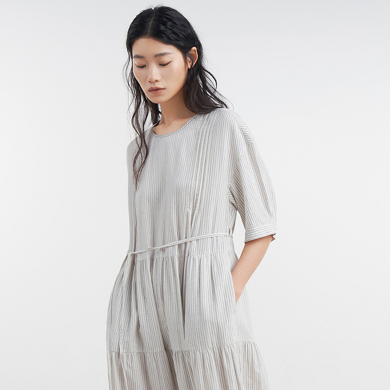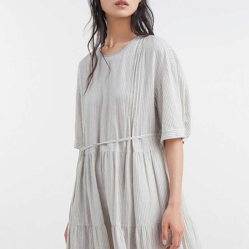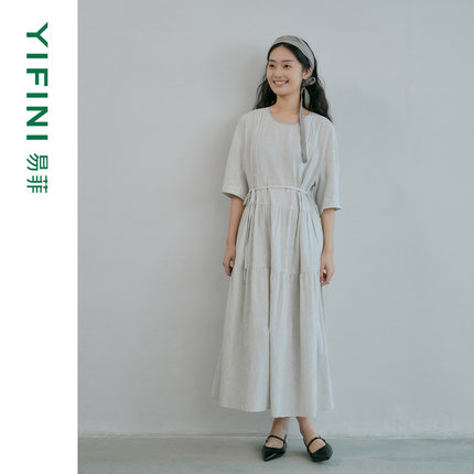 易菲木棉麻条纹宽松文艺连衣裙