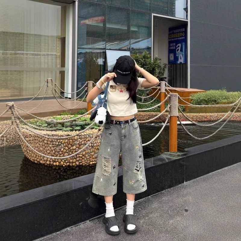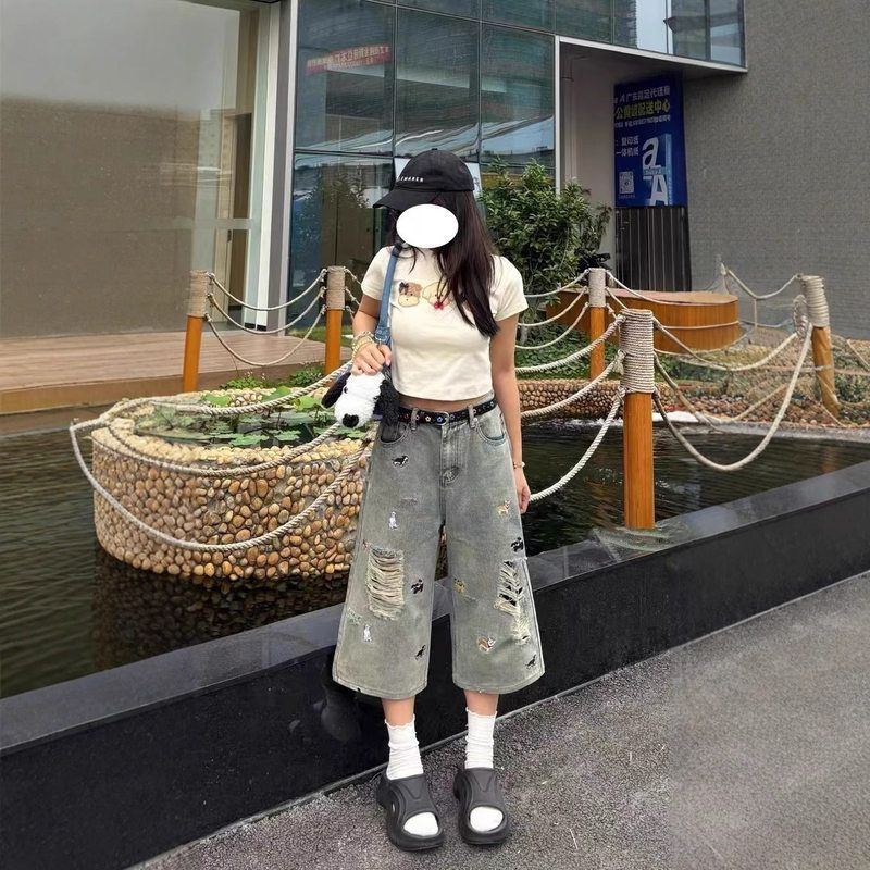 男女显瘦破洞牛仔裤潮牌直筒裤跨境美式趣味复古刺绣水洗子潮做旧