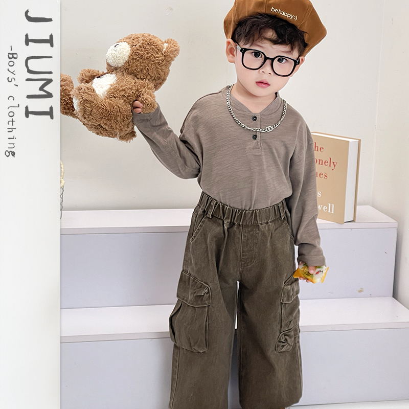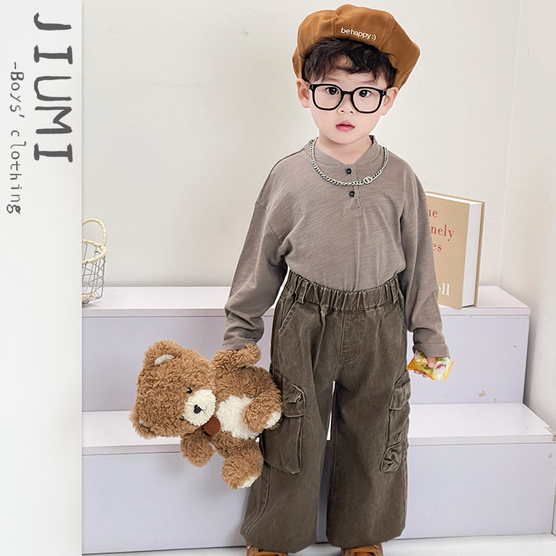 儿童秋季竹节棉长袖打底衫男童宽松工装长裤2男宝韩版纯棉百搭T恤