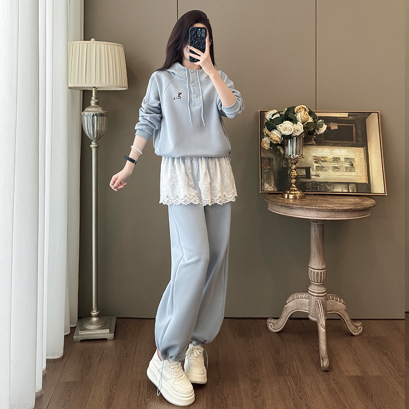 感蓝色休闲运动套装女春秋小个子时尚宽松连帽蕾丝卫衣两件套