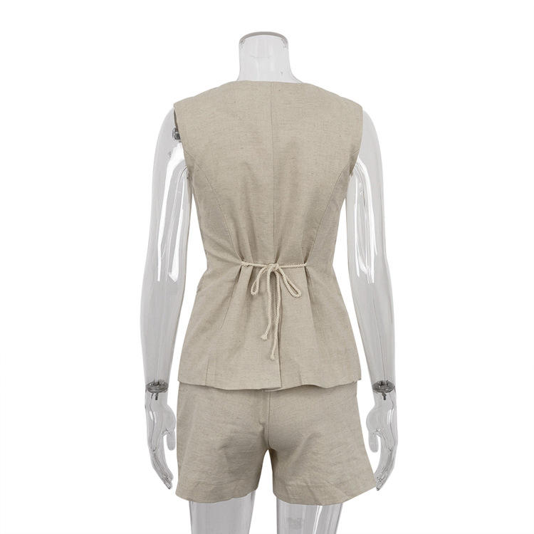 新款 2024欧美ins风棉麻西装无袖马甲背心套装夏天女短裤两件套