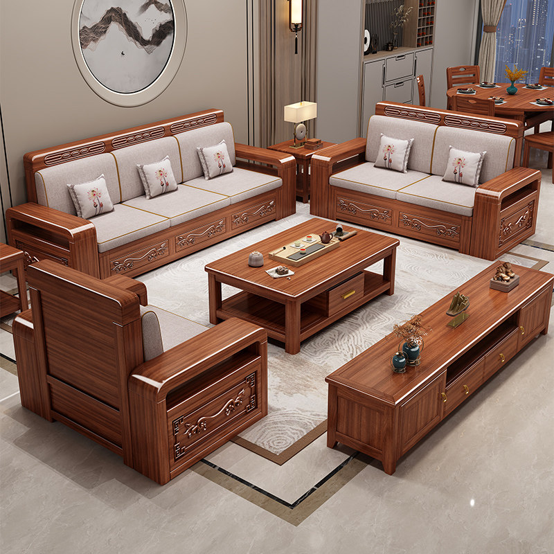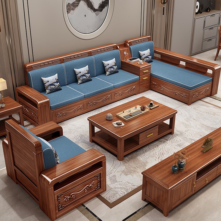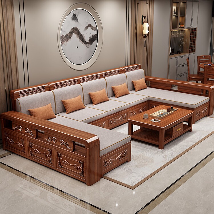 胡桃木实木沙发雕花组合新中式简约现代储物客厅转角贵妃木沙发