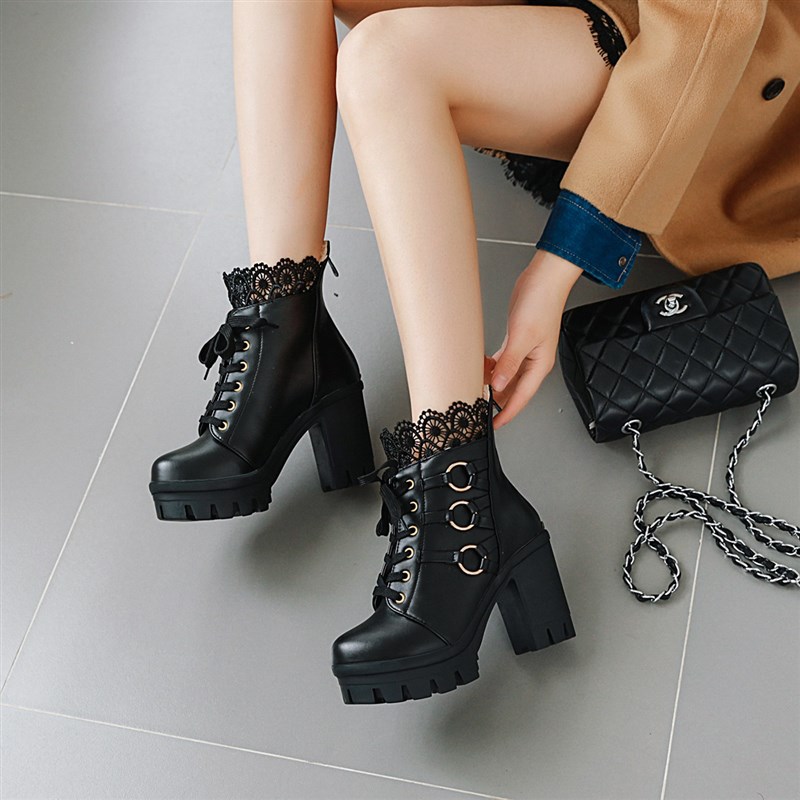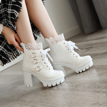 2021秋d冬新款系带后拉链高跟马丁靴女短靴子短筒靴粗跟女靴防水