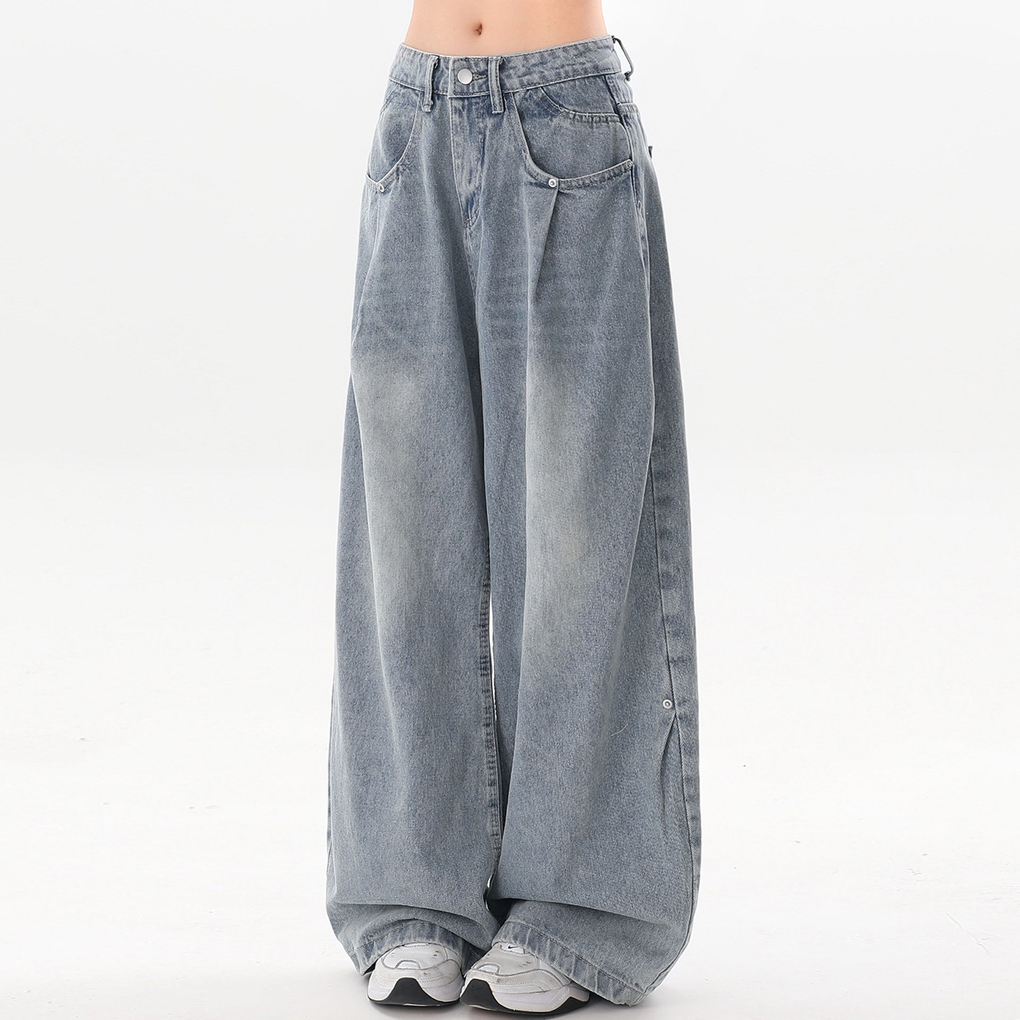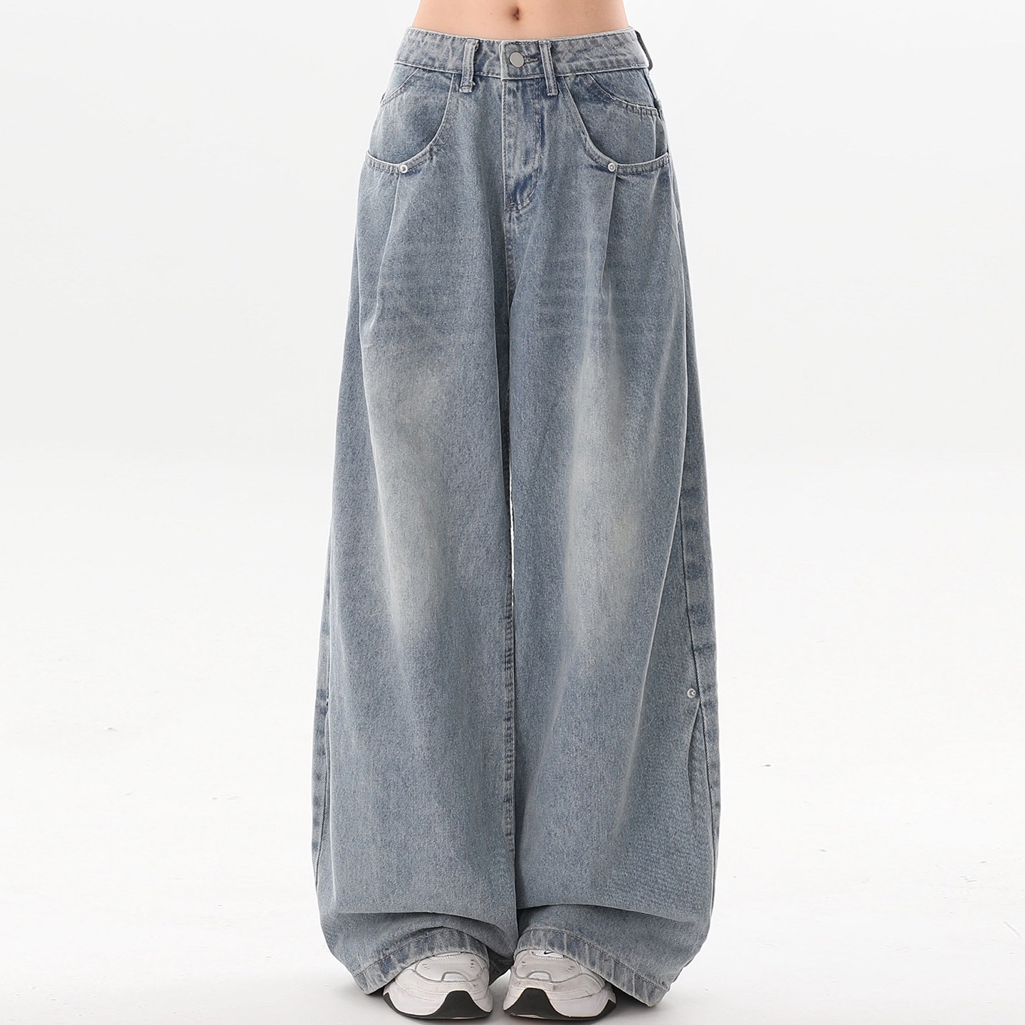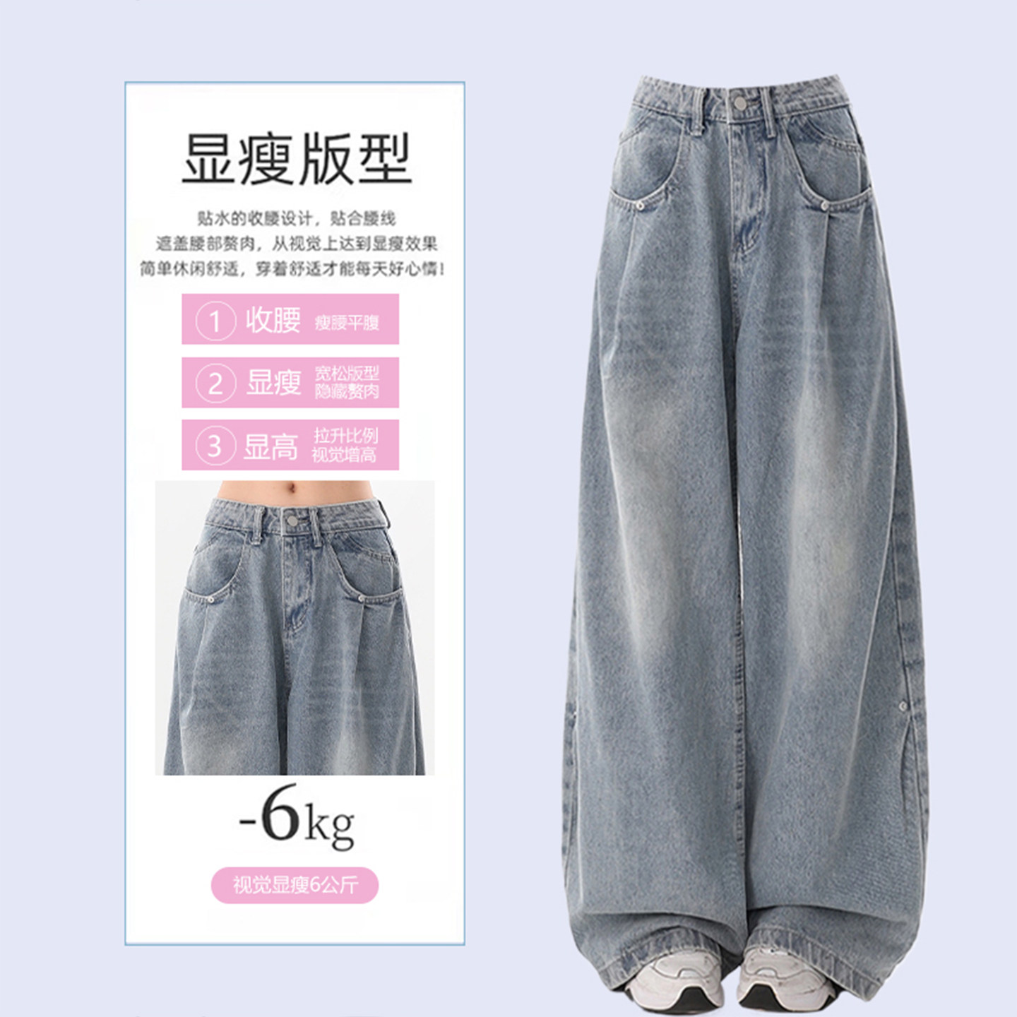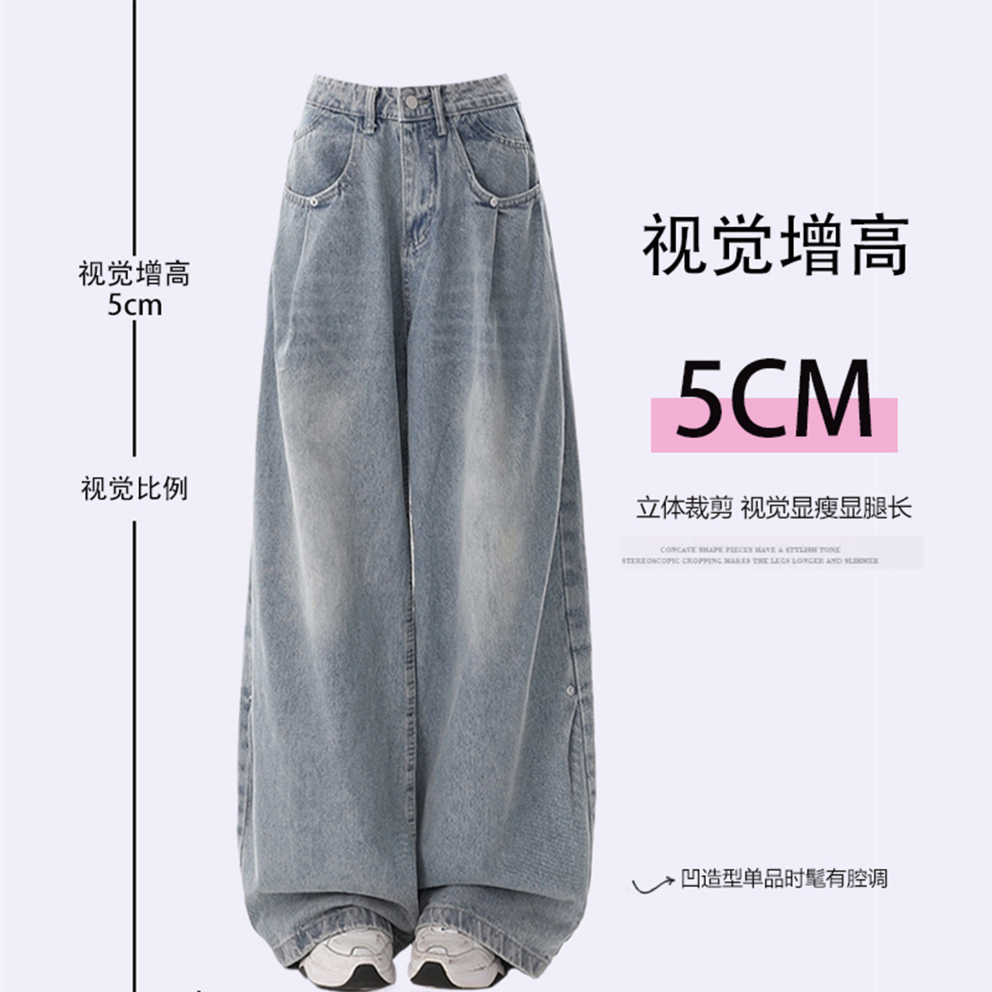 300斤大码女装宽松显瘦蓝色牛仔裤女胖mm美式设计感高腰阔腿裤子