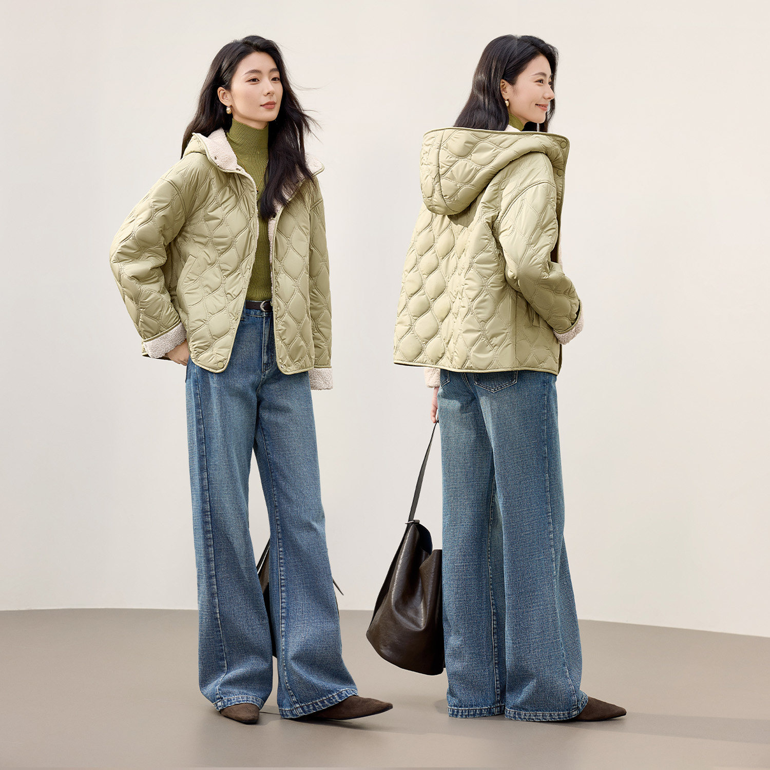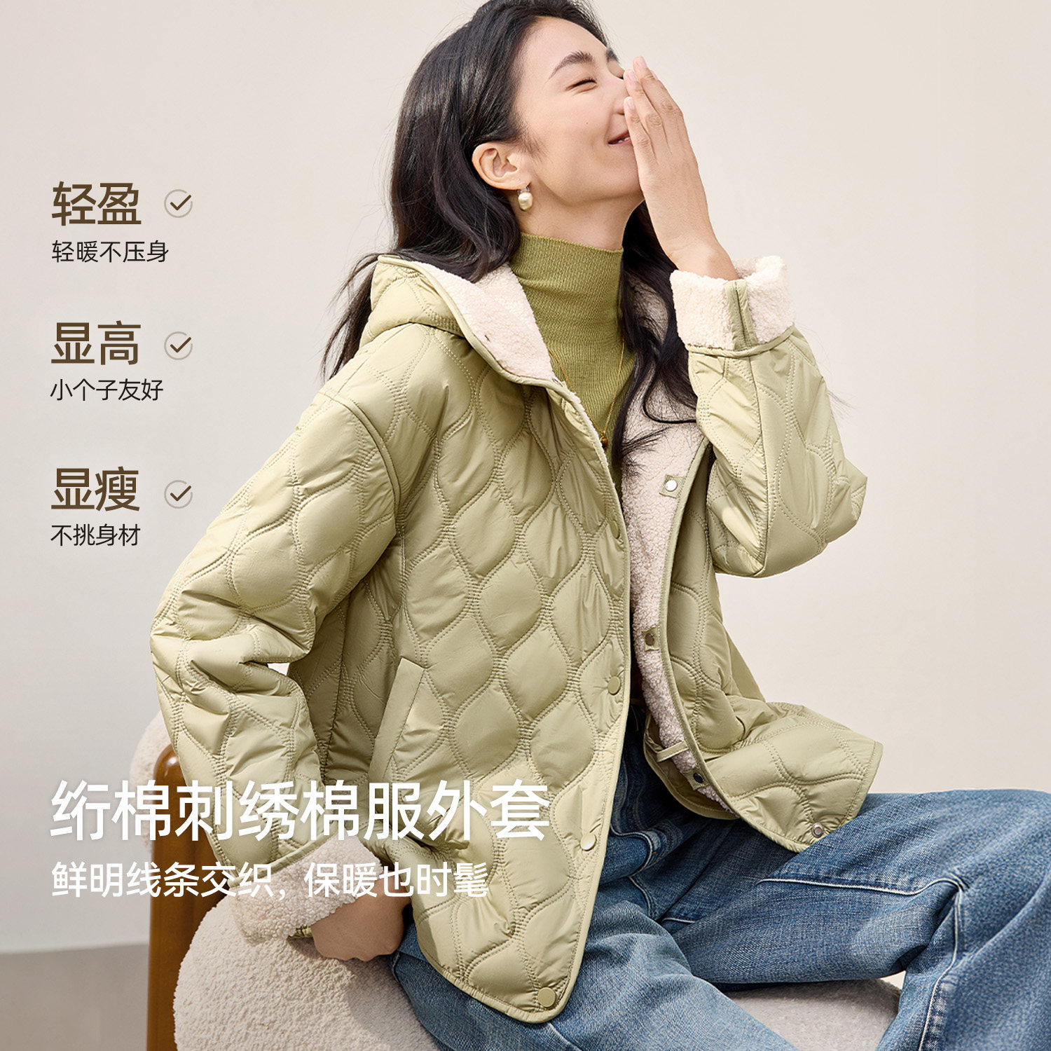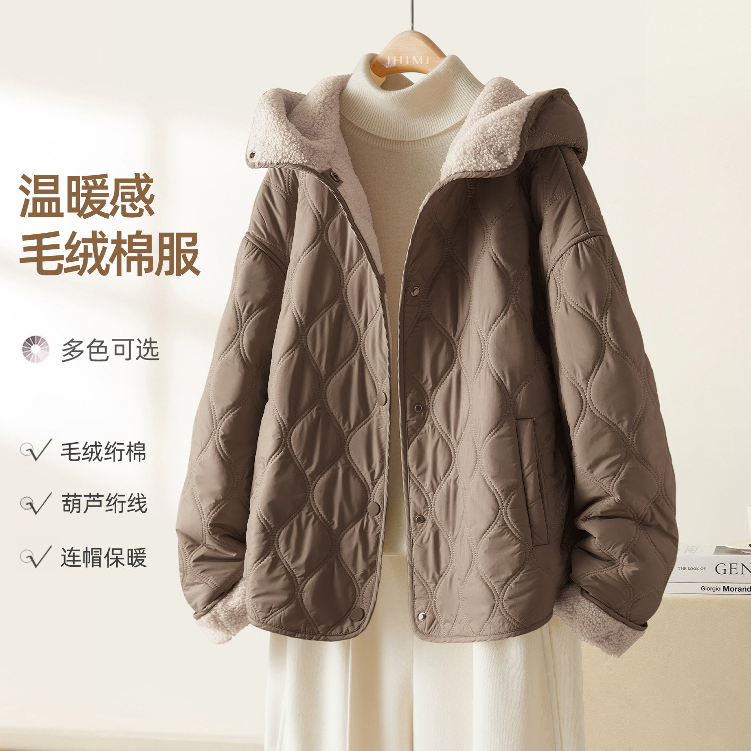 IHIMI海谧连帽毛绒拼接棉服外套女冬季加厚保暖百搭夹棉短款棉衣