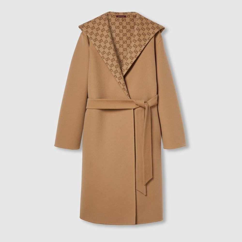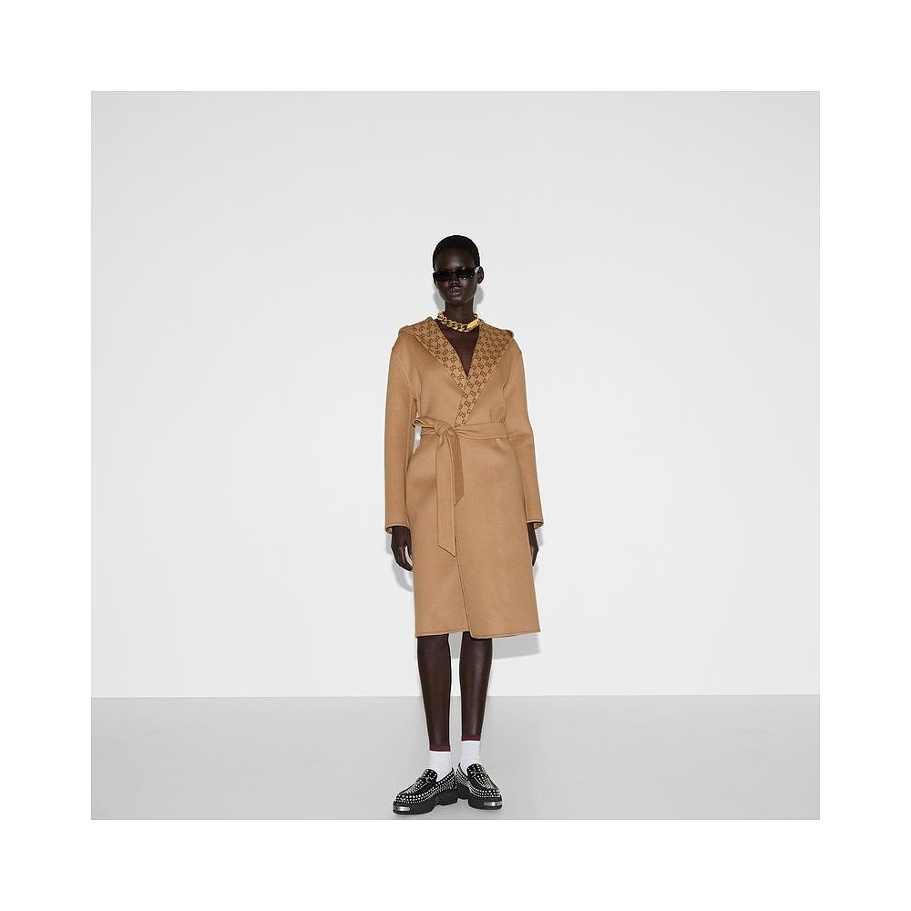 自营欧洲直邮Gucci古驰女士骆驼和乌木GG羊毛真丝混纺双面外套