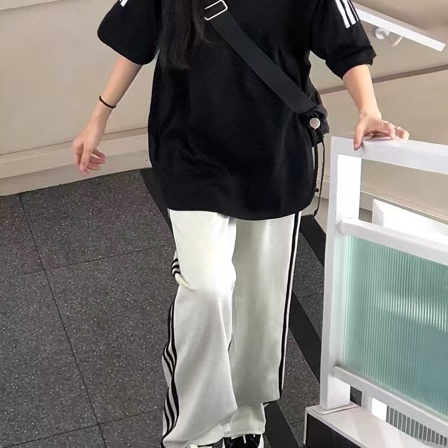 女童夏季新款三条杠运动套装中大童美式宽松短袖T恤+阔腿裤两件套