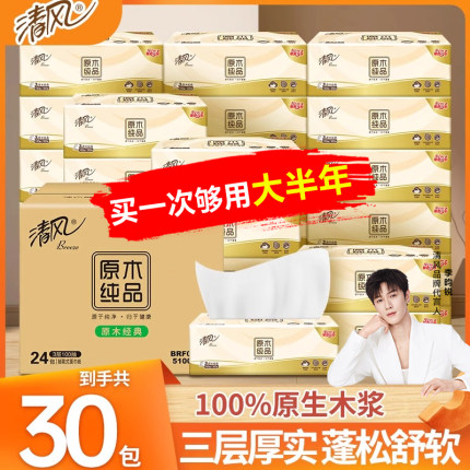清风原木抽纸家用纸巾整箱家用实惠装餐巾纸软包纸卫生纸批发纸抽
