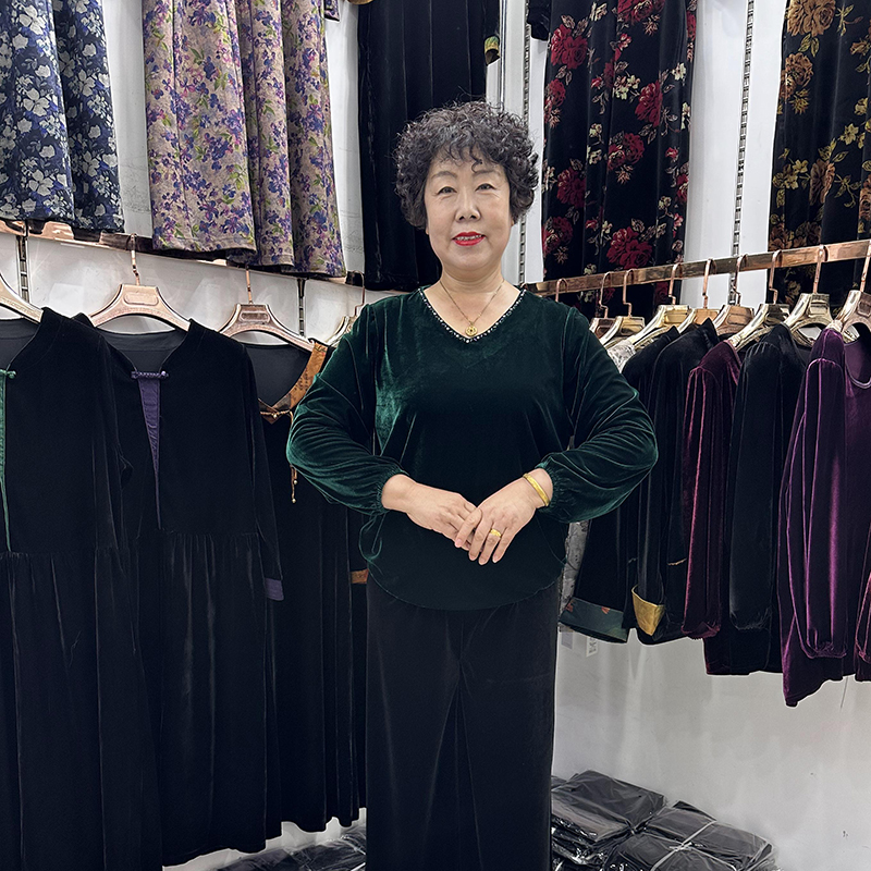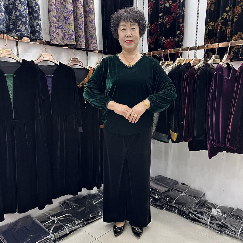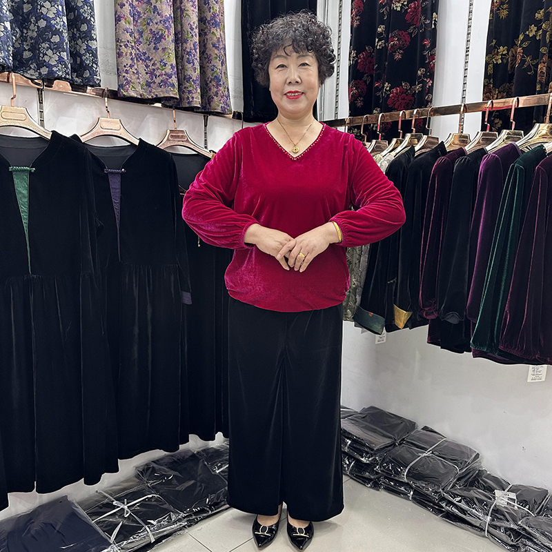 四十五岁妈妈秋季新款时尚丝绒V领t恤衫女50岁妇女纯色打底小衫