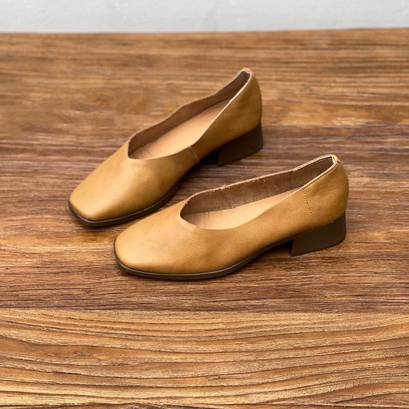 文艺真皮粗跟单鞋女复古手工圆头浅口休闲四季百搭中跟牛皮女鞋子
