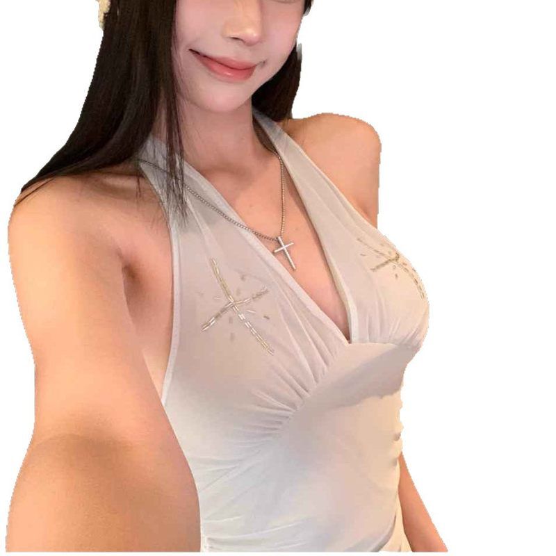 紫色v领烫钻挂脖吊带背心女夏纯欲风性感辣妹高级感褶皱修身上衣