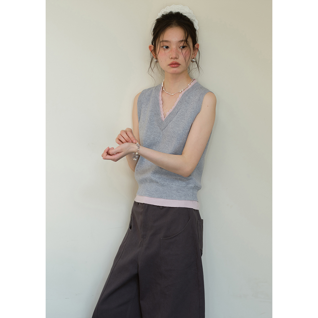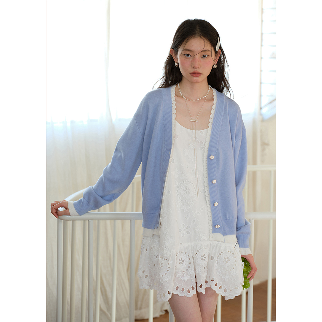 BLUEerror 花边假两件V领蓝色开衫套装女宽松短款针织衫外套早秋
