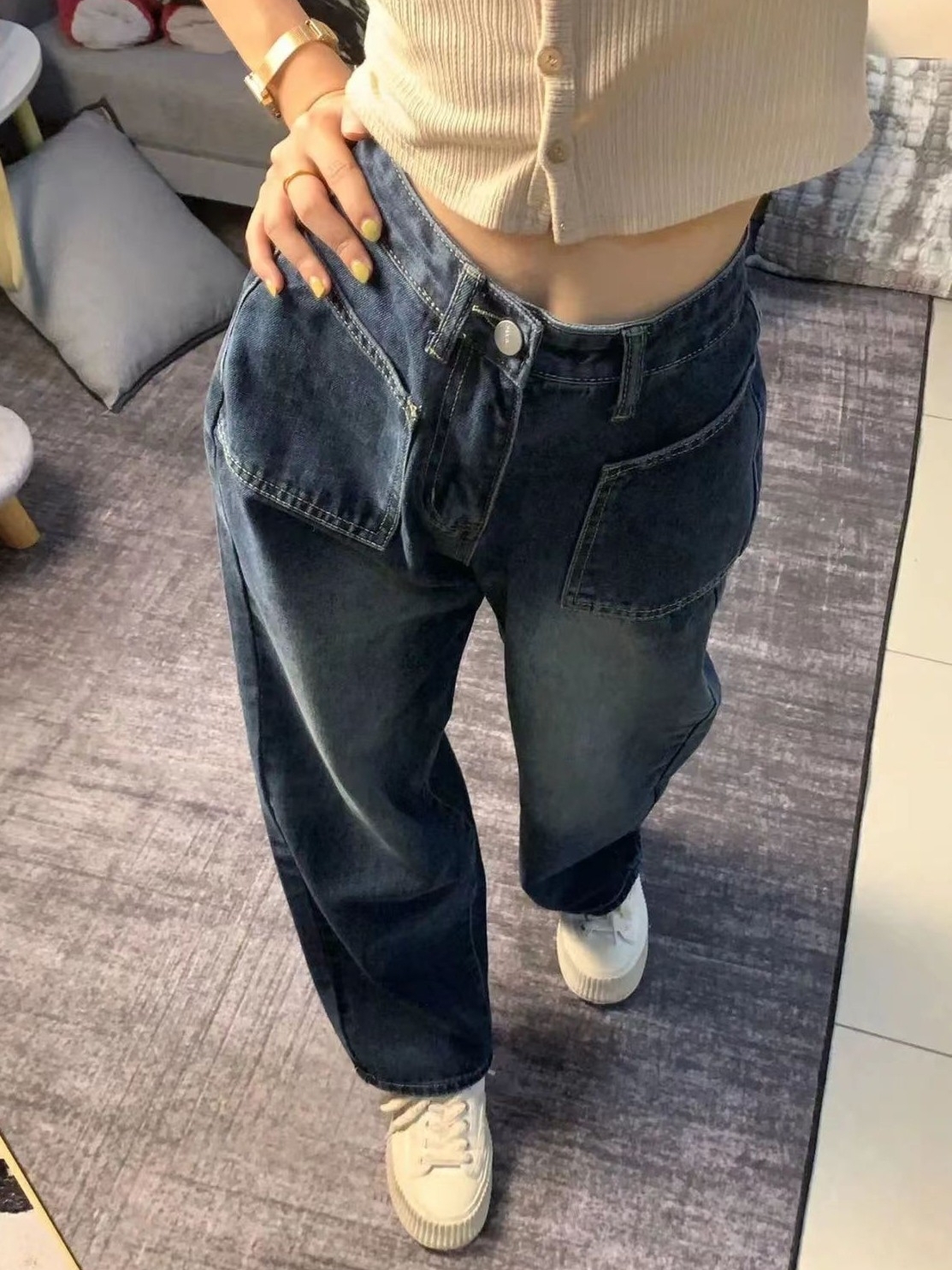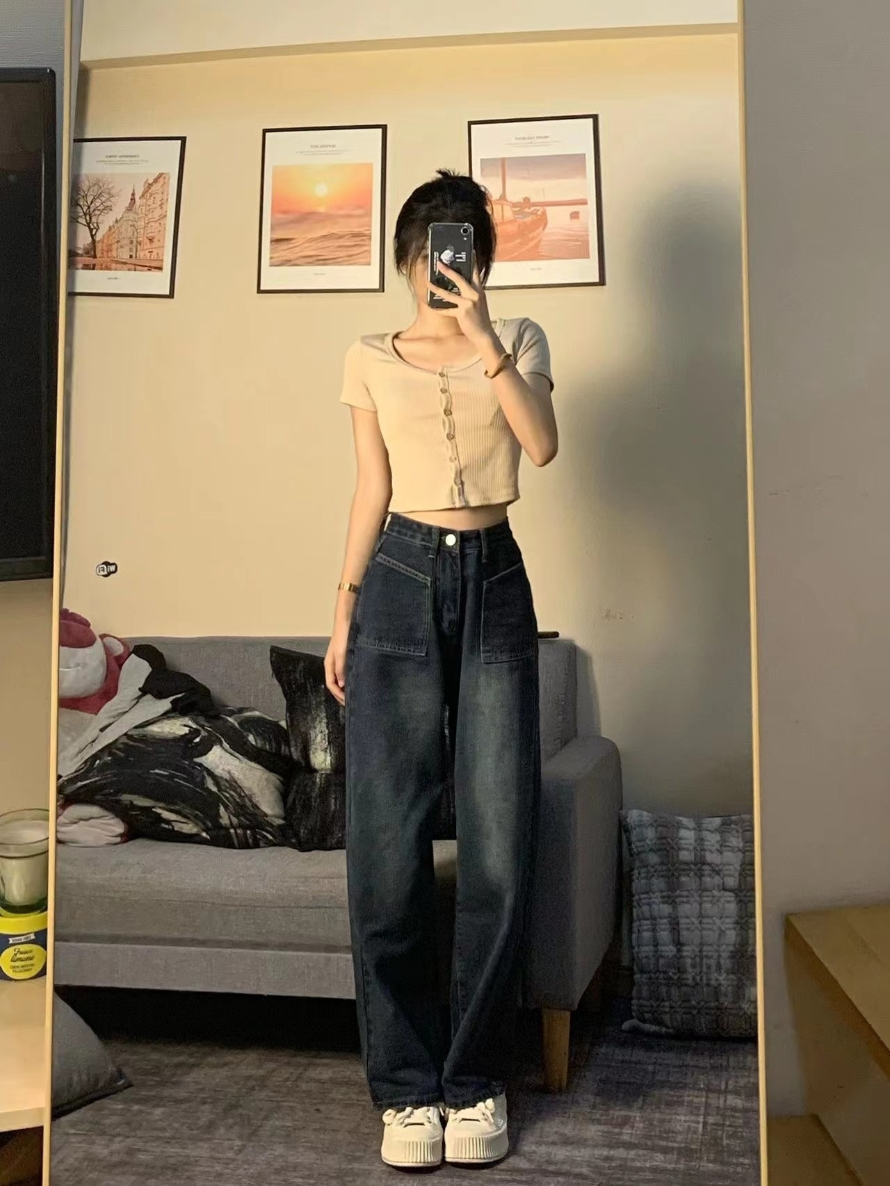 复古蓝垂感拖地牛仔裤