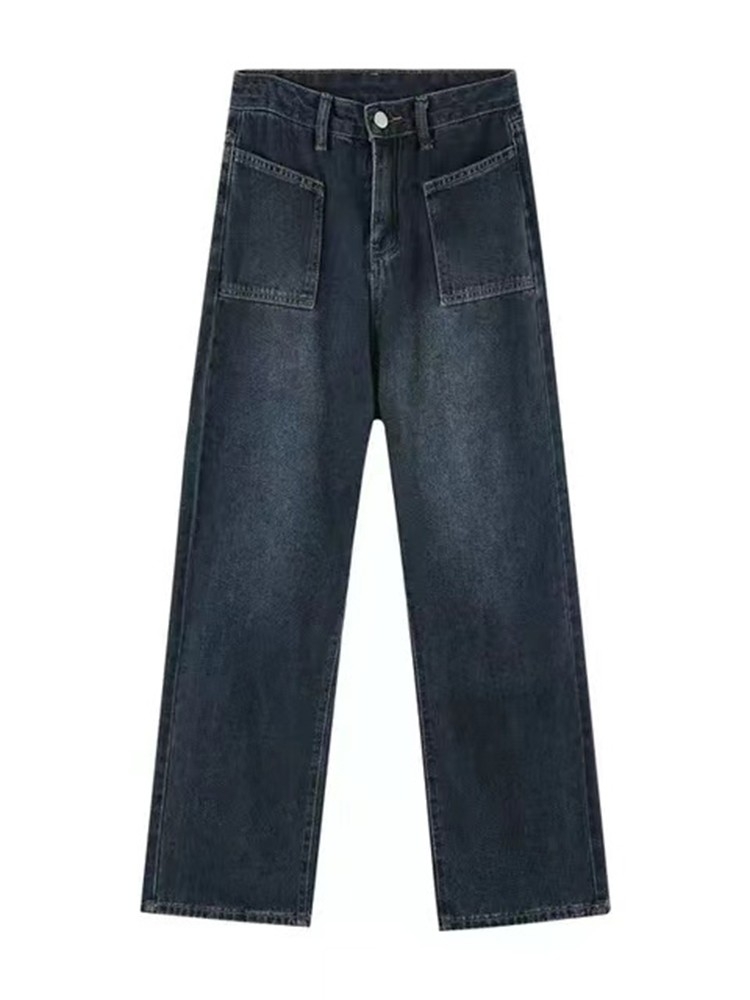 复古蓝阔腿牛仔裤春秋季小众设计ins潮高腰显瘦直筒垂感拖地长裤
