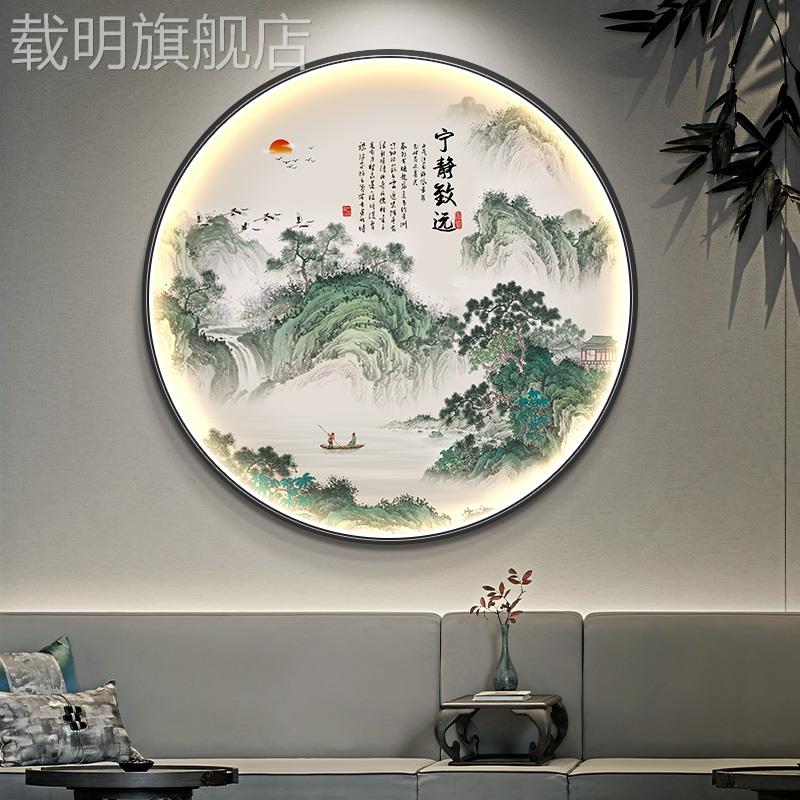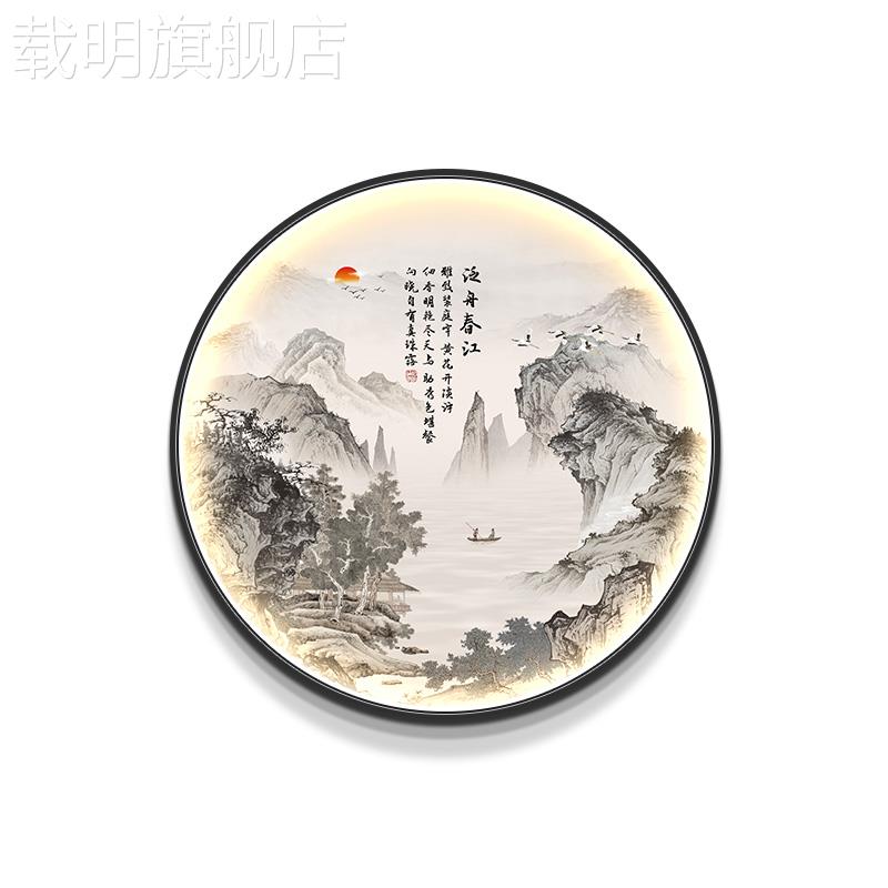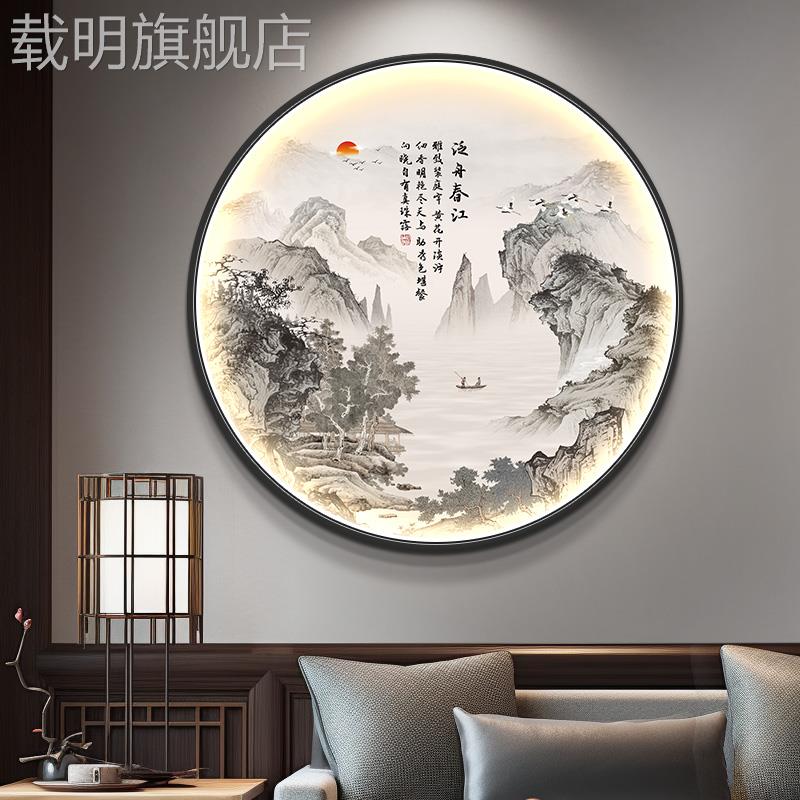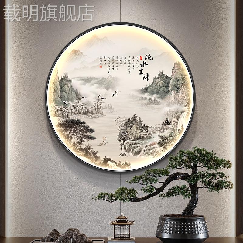 圆形玄关装饰画新中式山水墨画走廊过道尽头挂画客厅背景墙壁灯画
