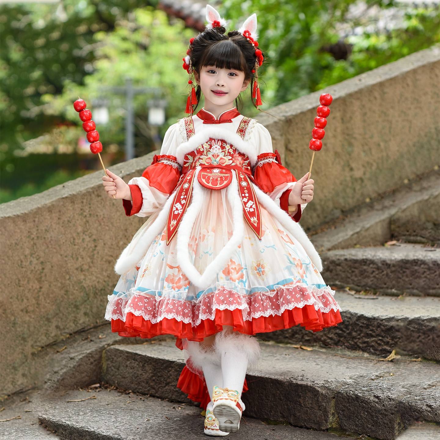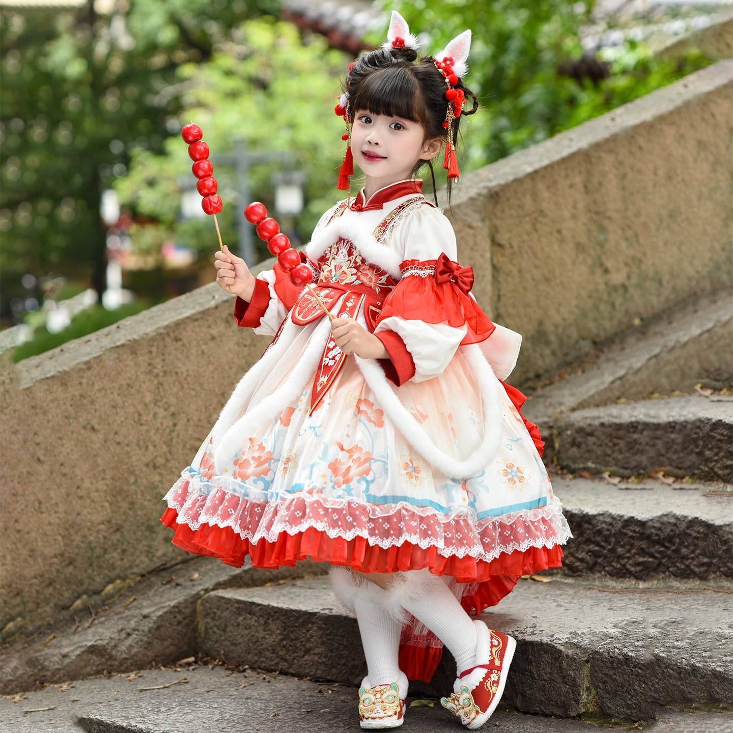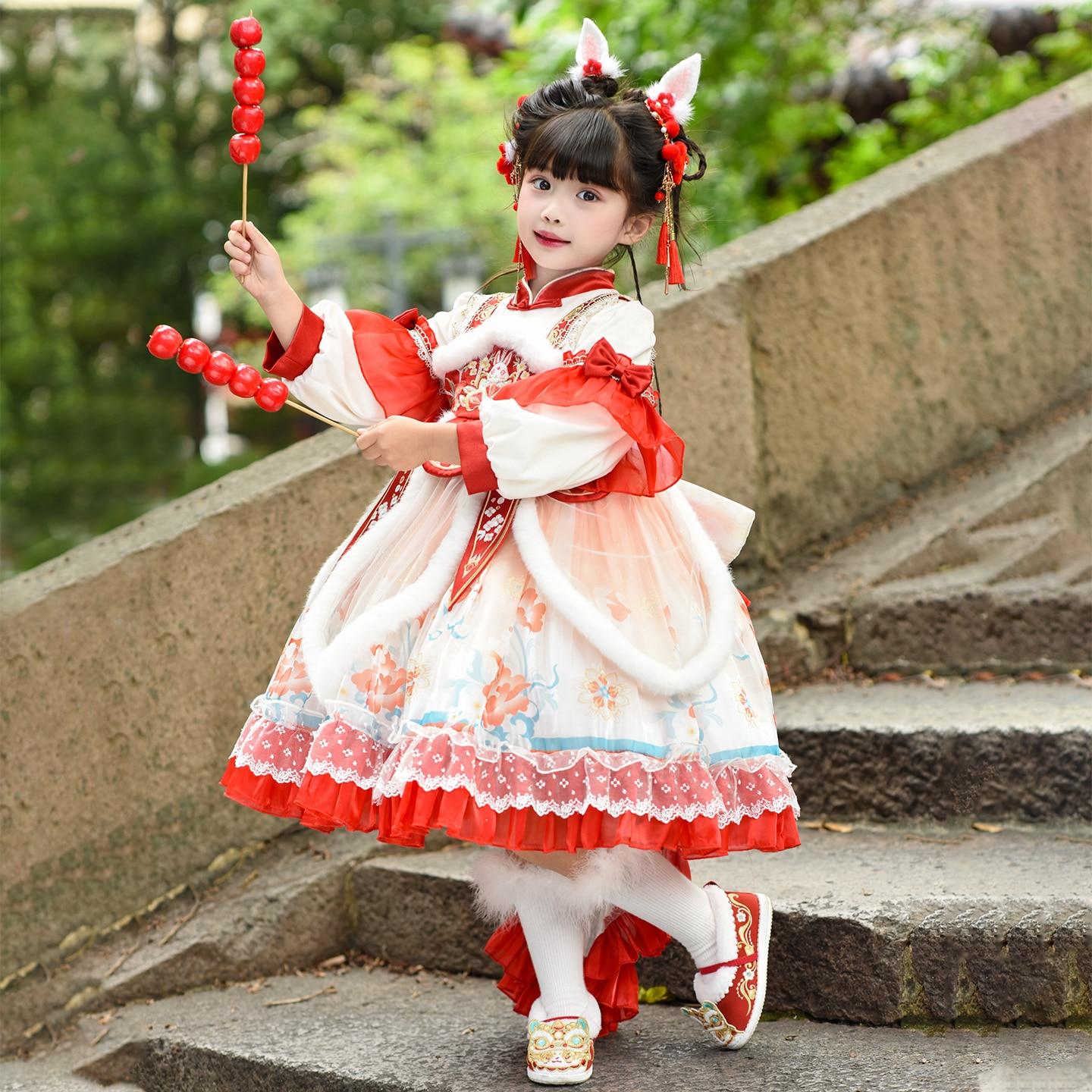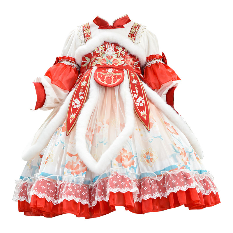 汉服女童秋冬唐装加绒加厚拜年服洛丽塔红色连衣裙冬季新年公主裙