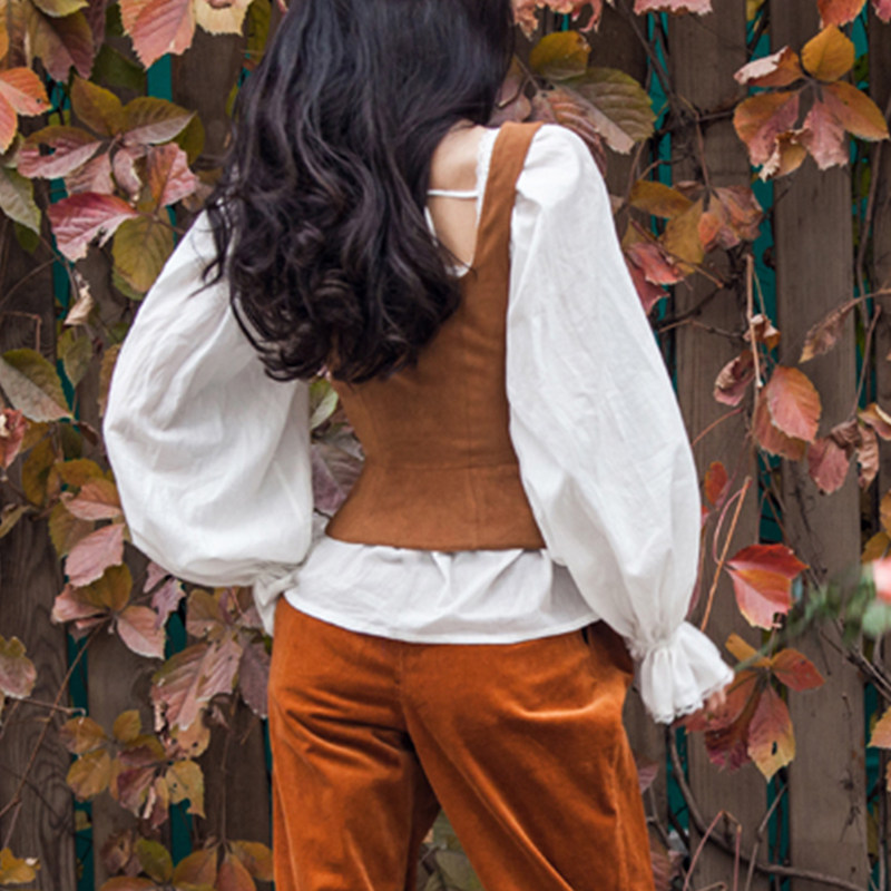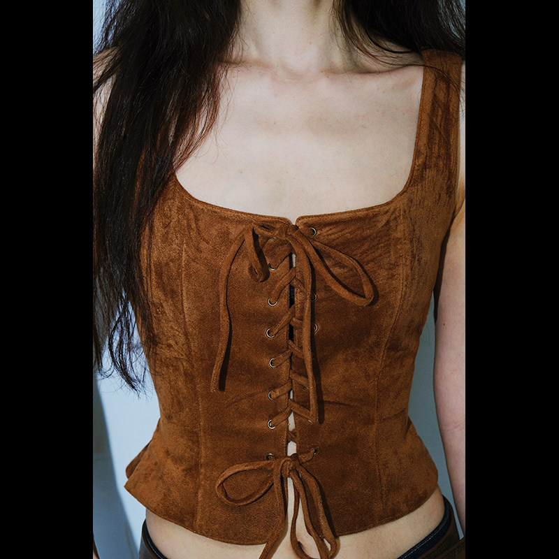 LISAYU法式复古无袖背心方领马夹外套系带仿皮绒修身显瘦马甲坎肩