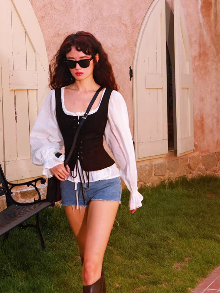 lisayu背心法式复古系带方领