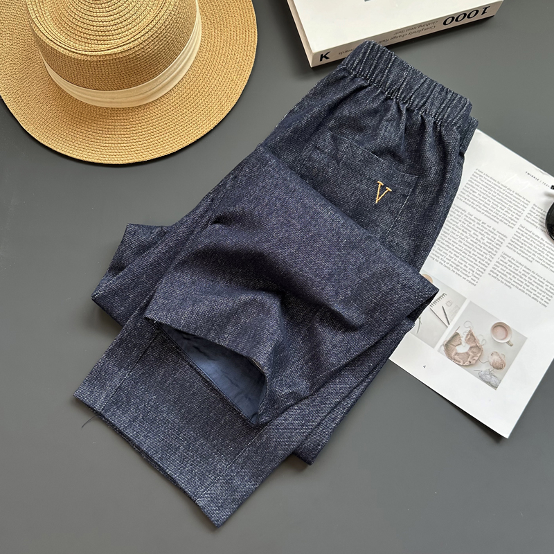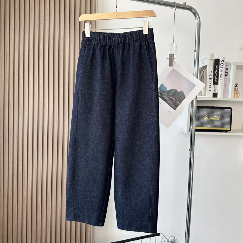 色织深蓝软牛仔松紧萝卜裤九分裤