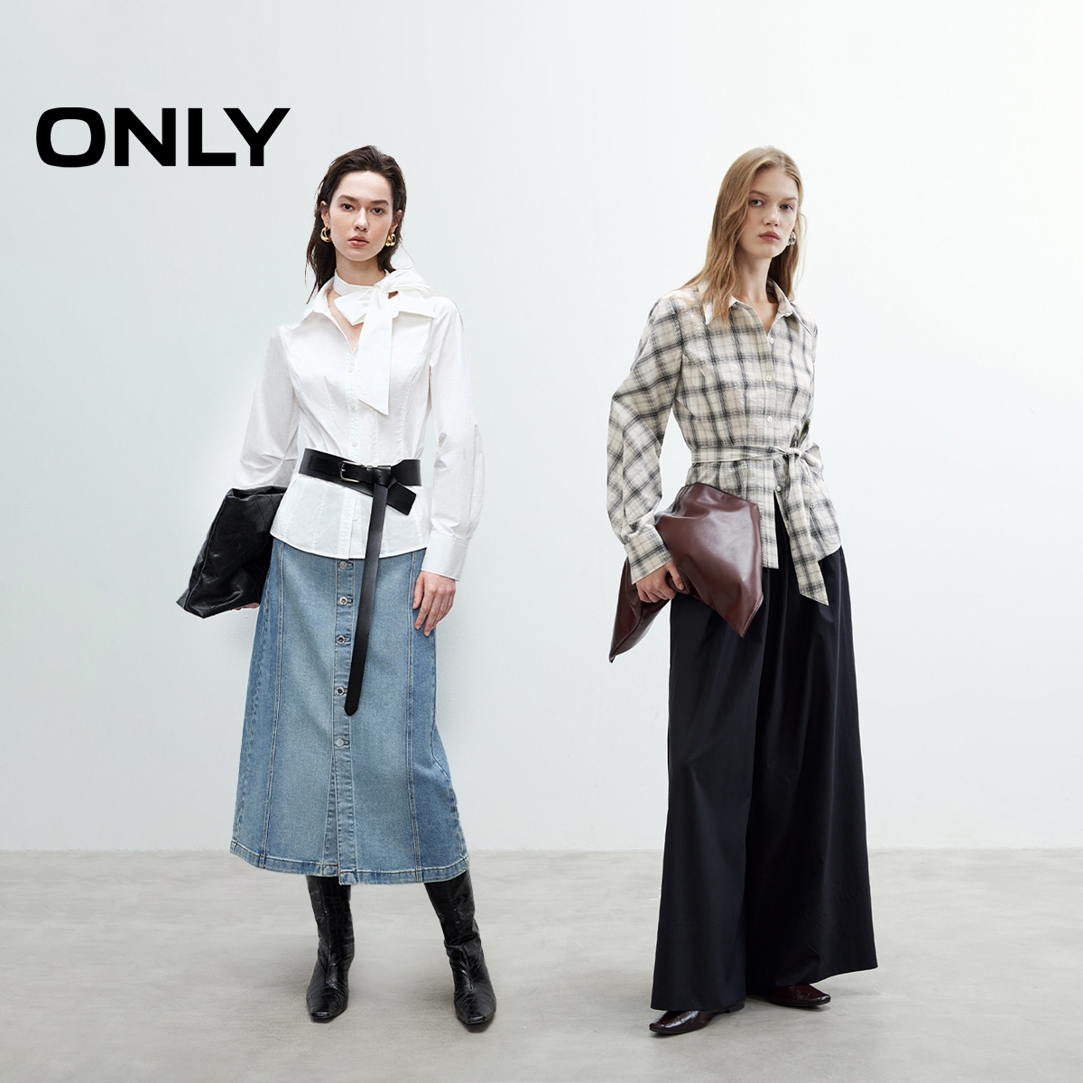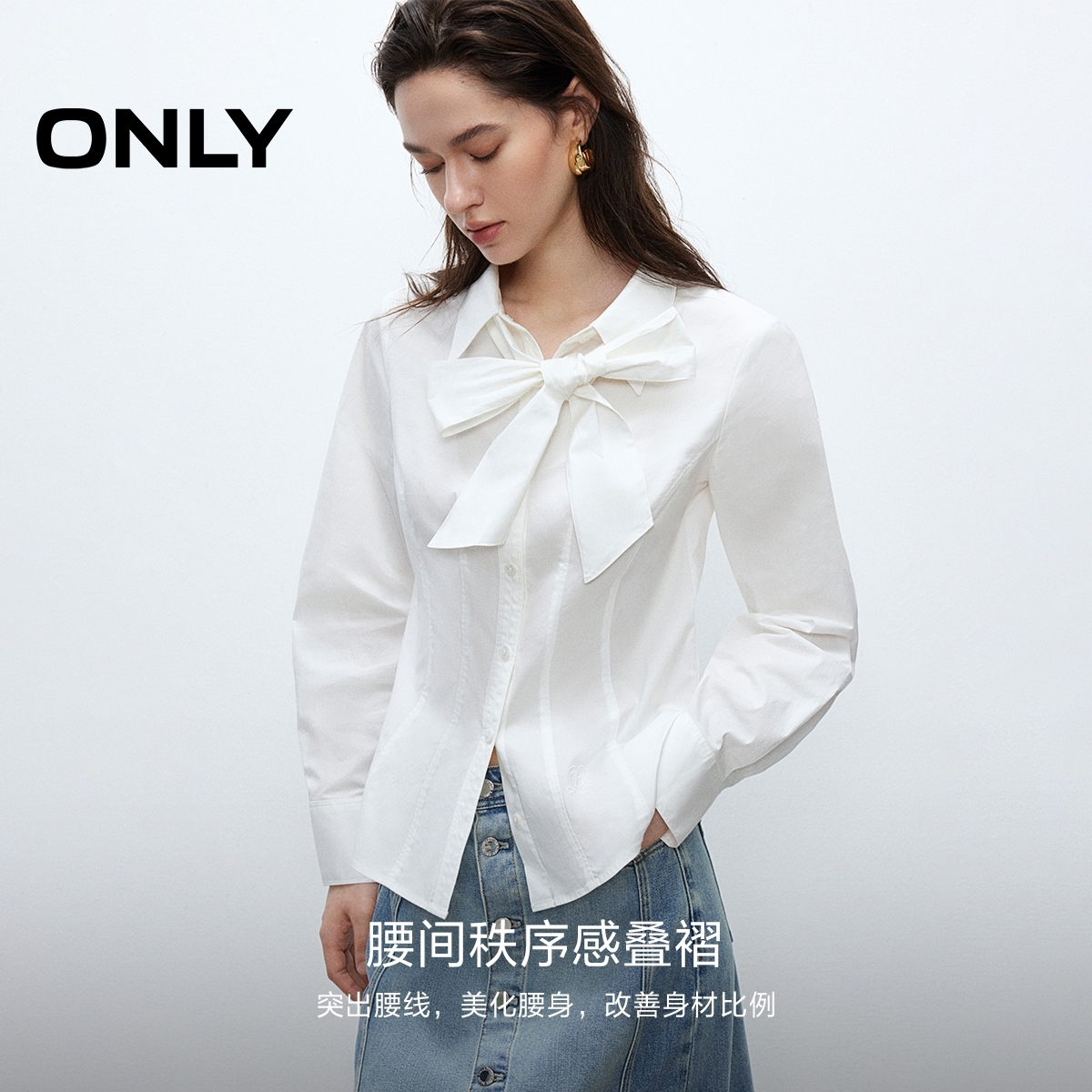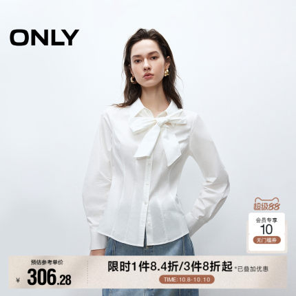 ONLY2025秋季新款精致刺绣气质长袖翻领蝴蝶结正肩收腰衬衫女
