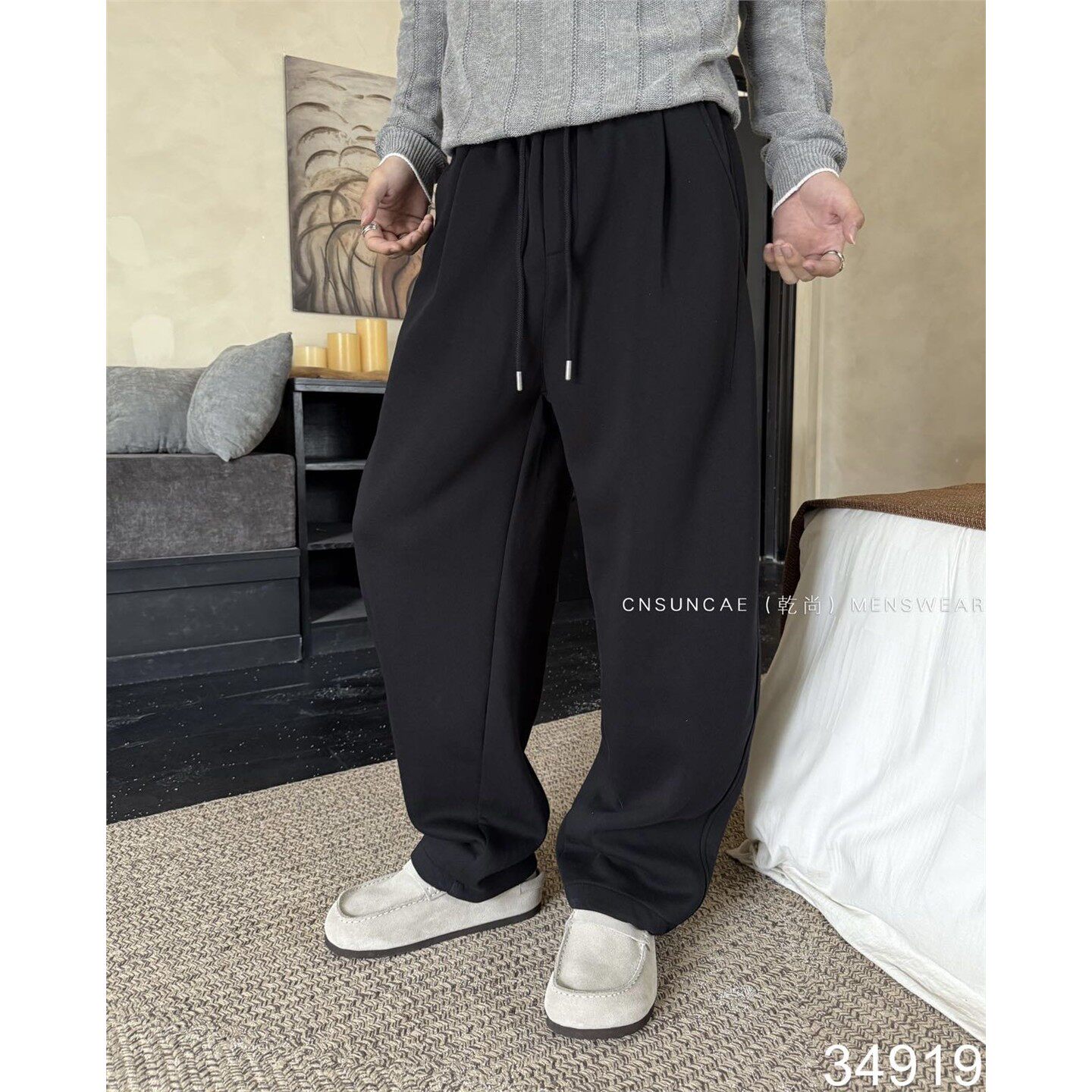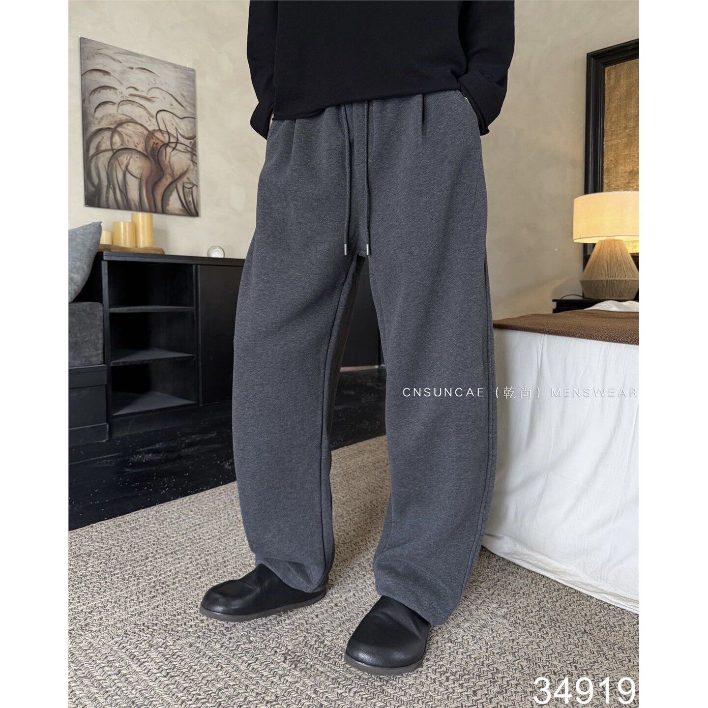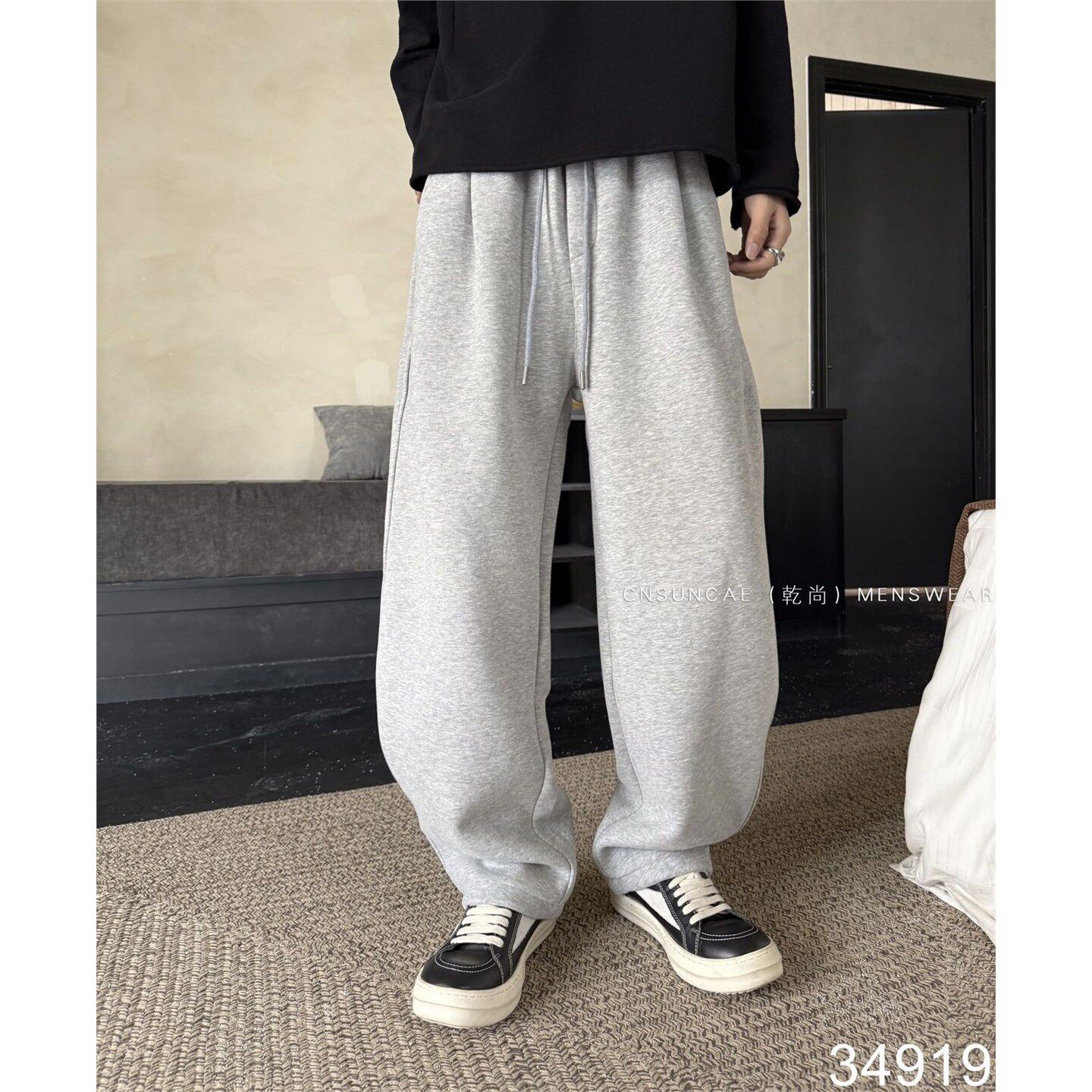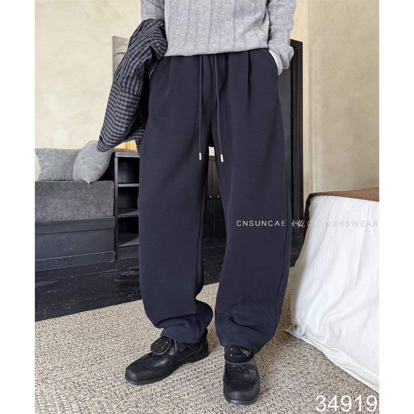 重磅简约纯色直筒加绒休闲裤男冬季宽松加厚保暖阔腿针织运动卫裤