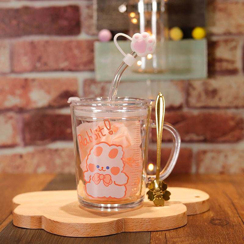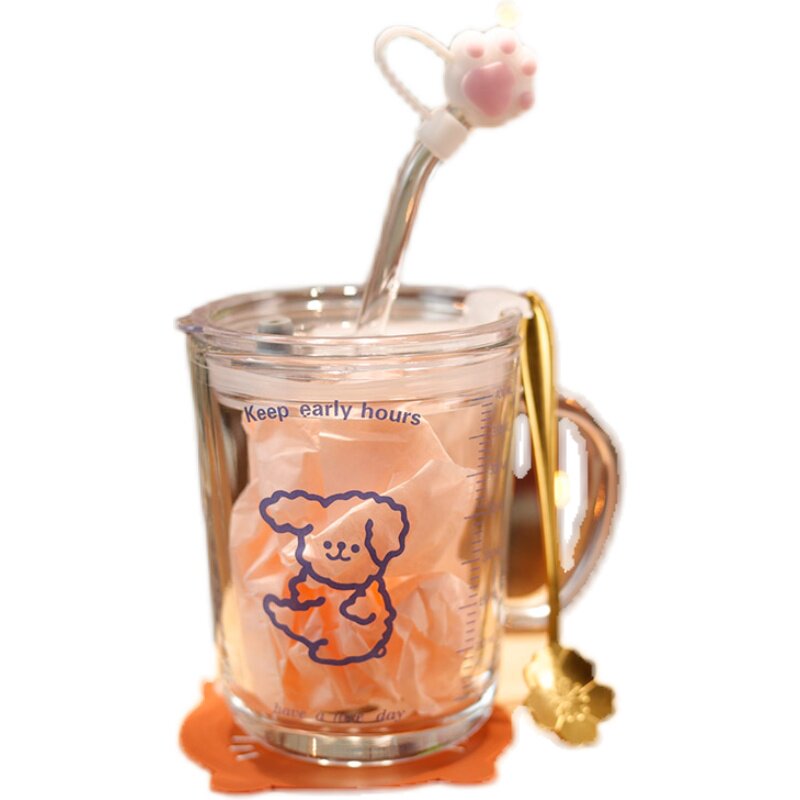 速发吸高杯玻璃杯儿童水杯管颜值可爱无铅耐热带把手刻度奶牛杯