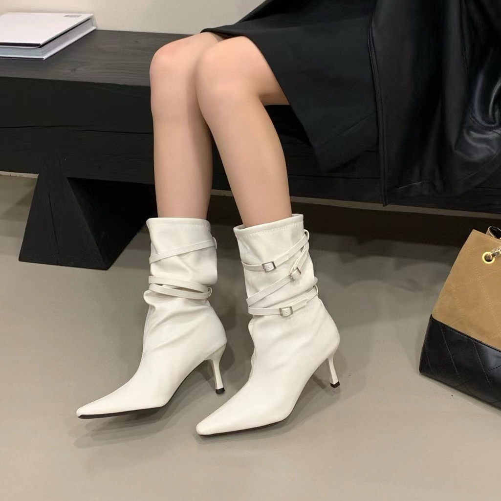 2025秋冬新款细跟高跟靴堆堆靴褶皱靴皮带扣女靴马丁靴西部靴短靴