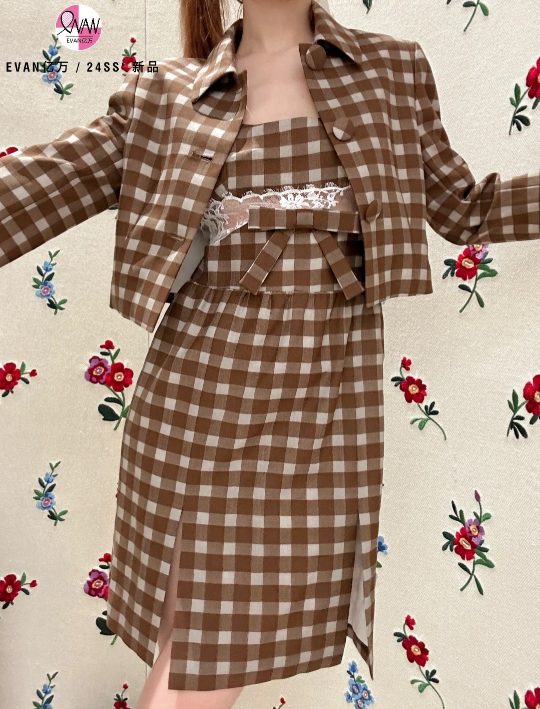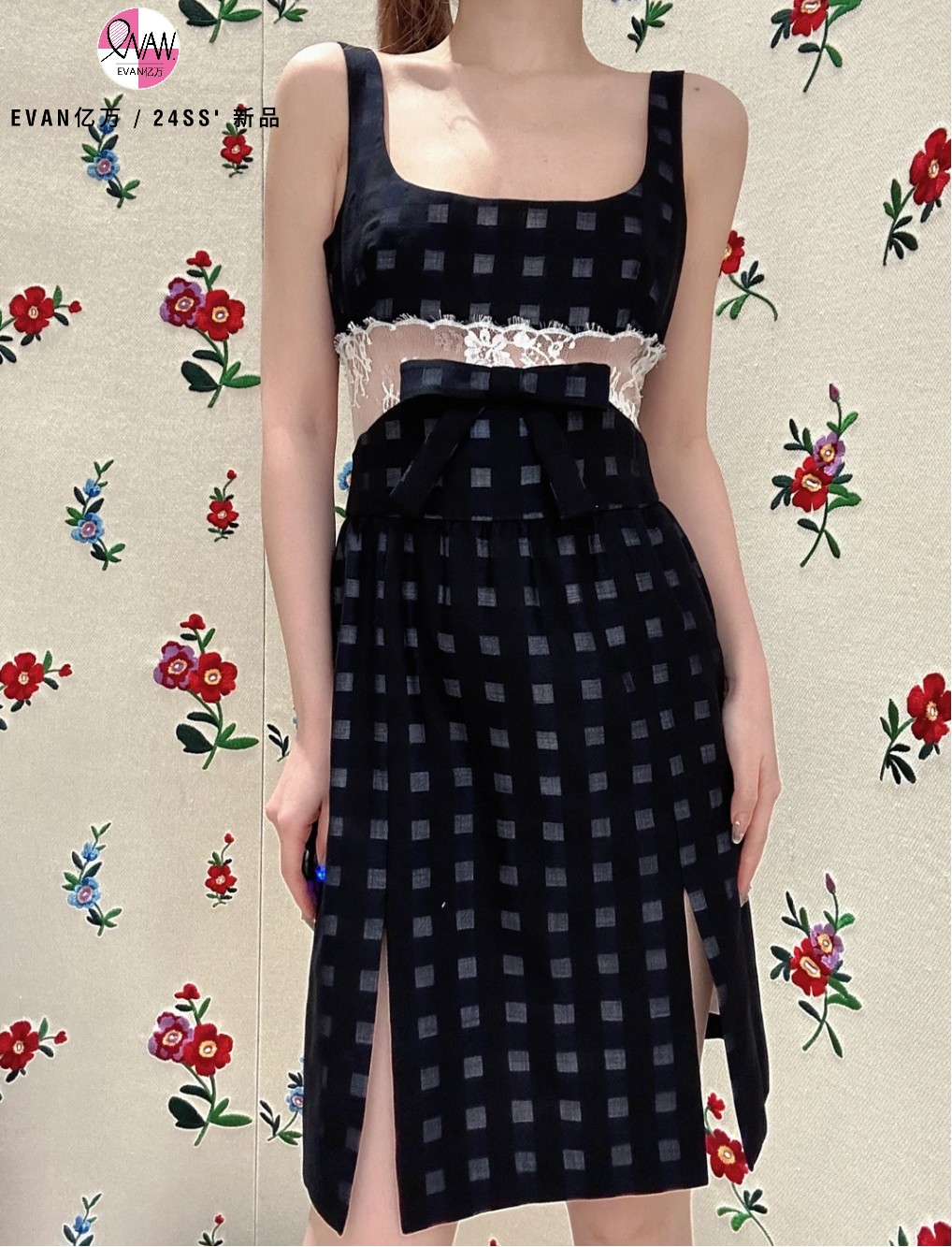 25孤品限量款】甜美小众设计格纹蕾丝拼接性感吊带收腰开叉连衣裙