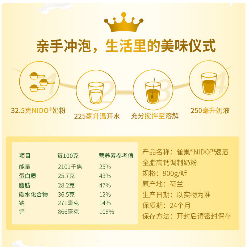 【自营】雀巢nido荷兰进口全脂早餐奶高钙高蛋白成人奶粉900g*2罐