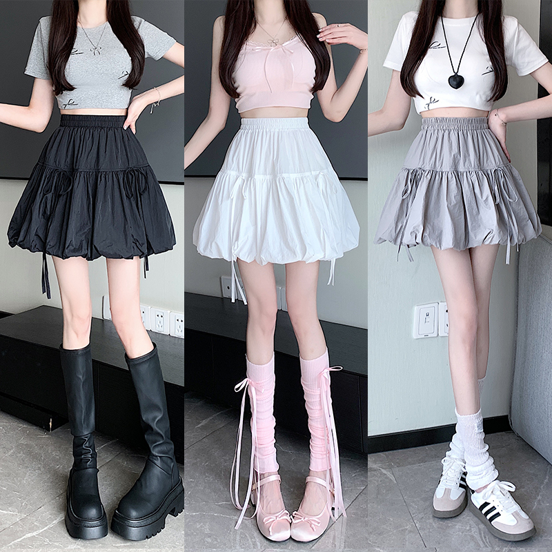 灰色云朵蓬蓬裙A字花苞半身裙女2025新款夏季包臂蝴蝶结灯笼短裙