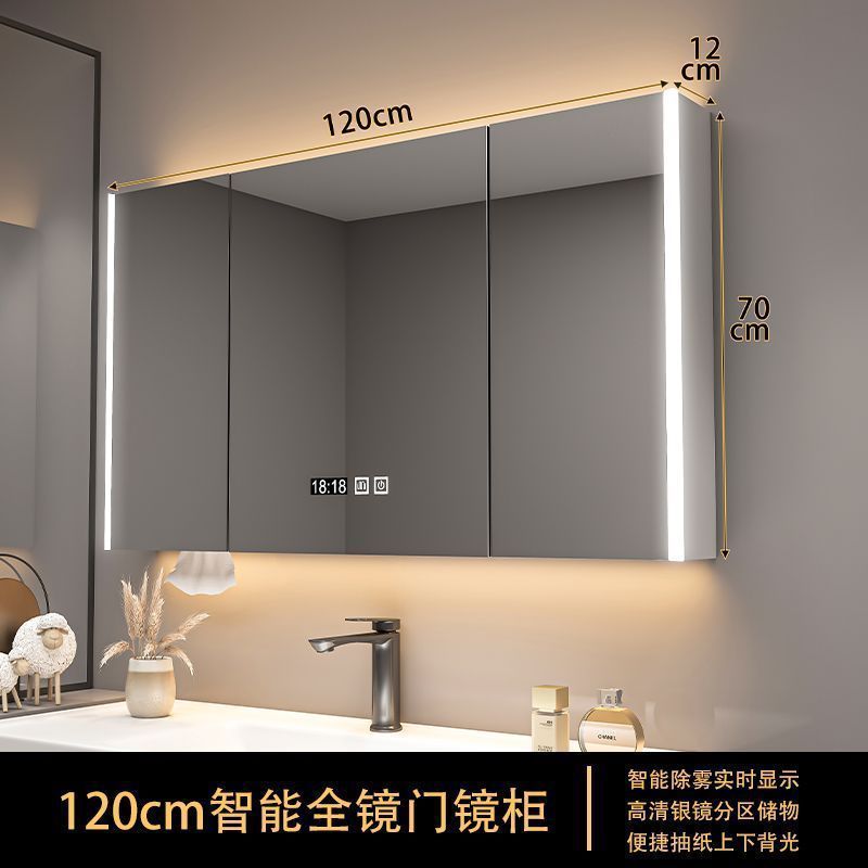 实木浴室智能镜柜镜子挂墙式带灯除雾卫生间美妆单独带收纳一体柜