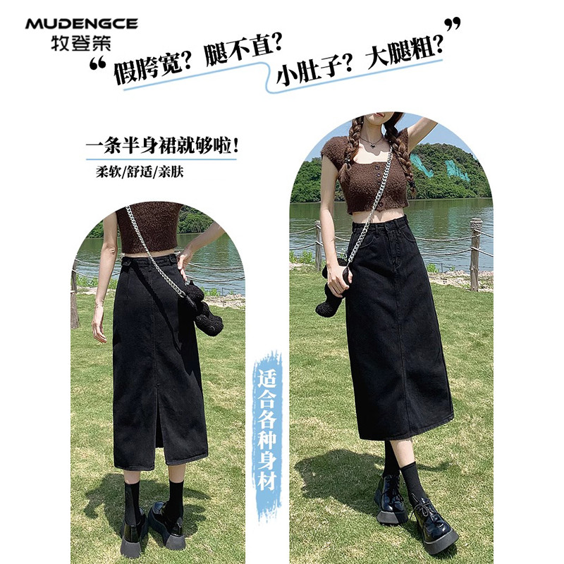 时尚开叉牛仔半身裙女2025春季新款小个子高腰A字中长款包臀裙子