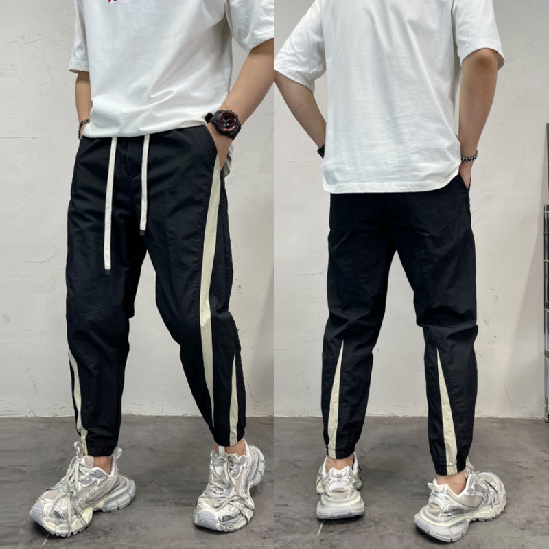 夏季薄款休闲速干宽松哈伦裤男士条纹拼接撞色户外运动束脚九分裤