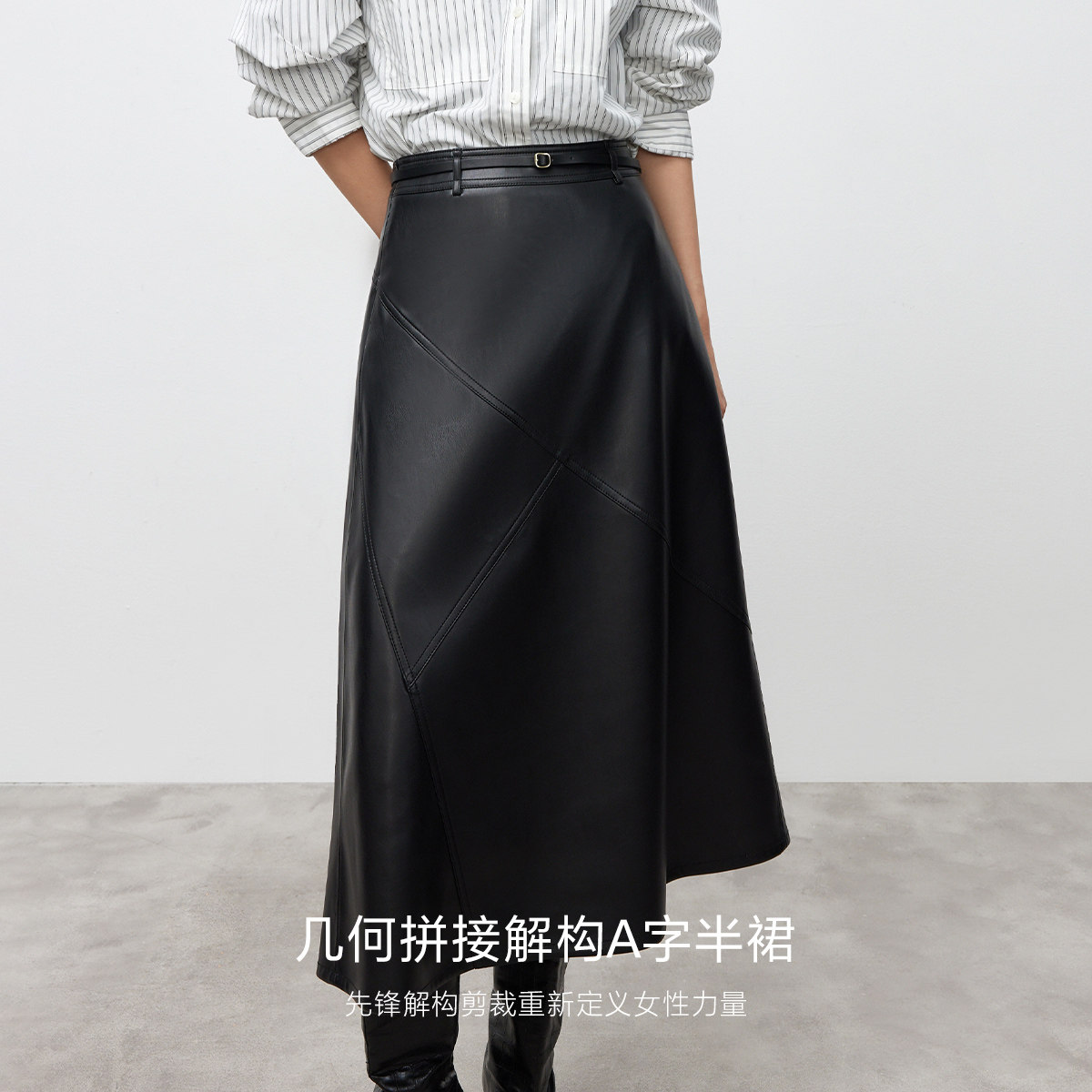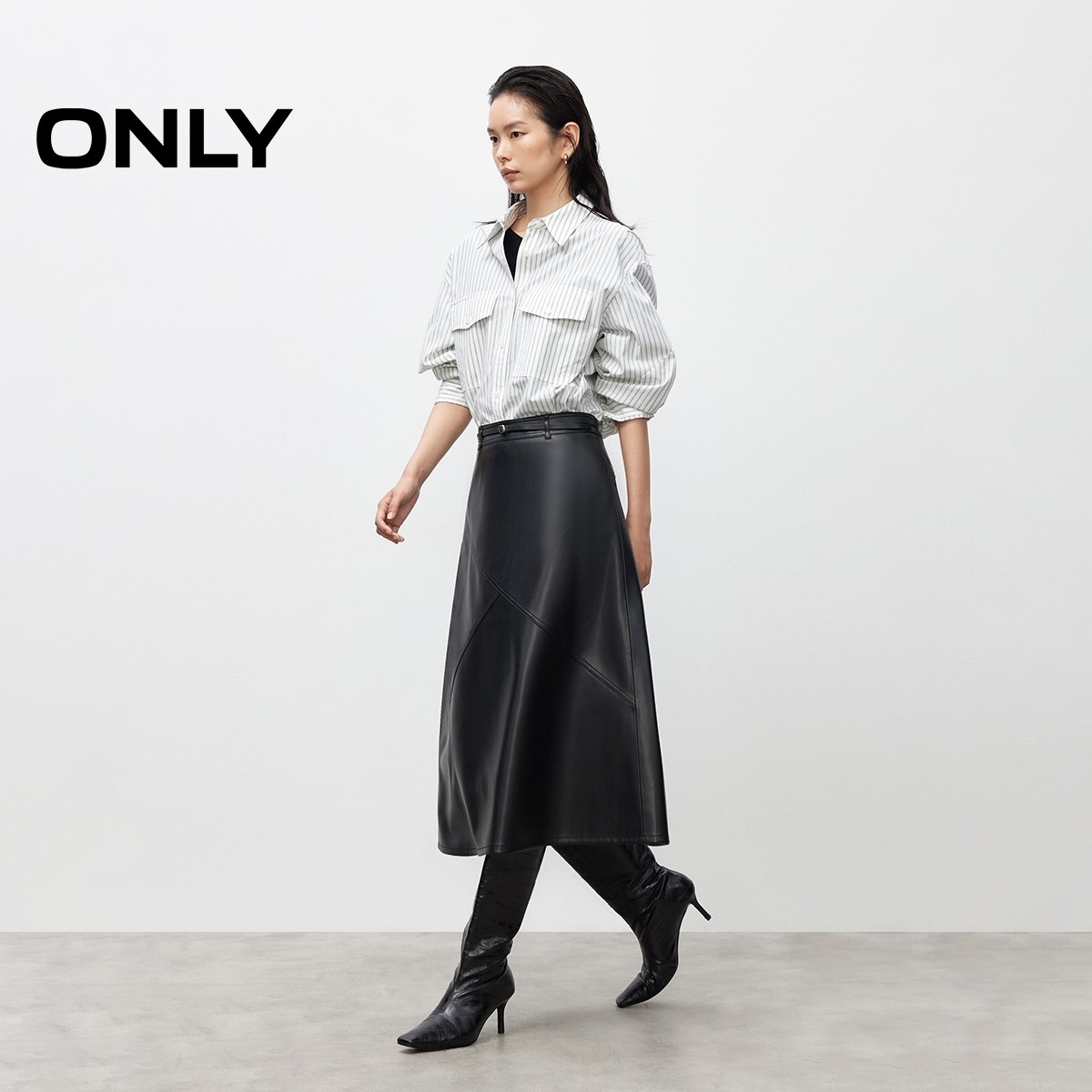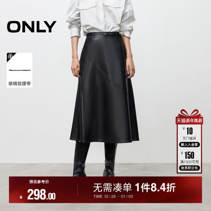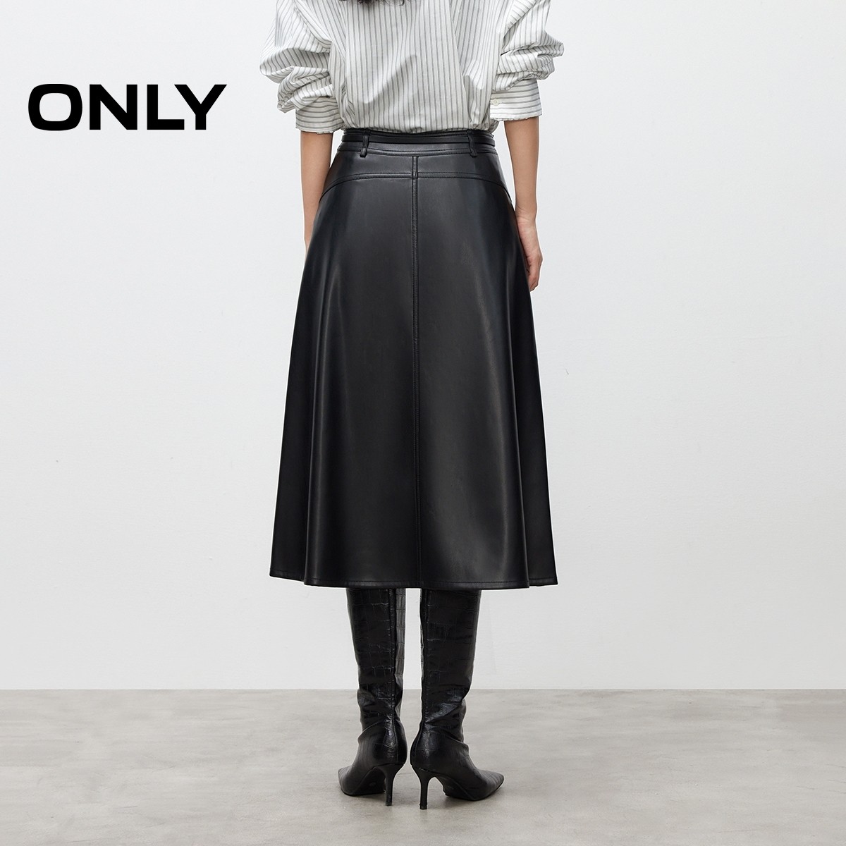 ONLY2025冬季新款优雅垂坠A摆高腰纯色显瘦拼接PU中长裙半身裙女