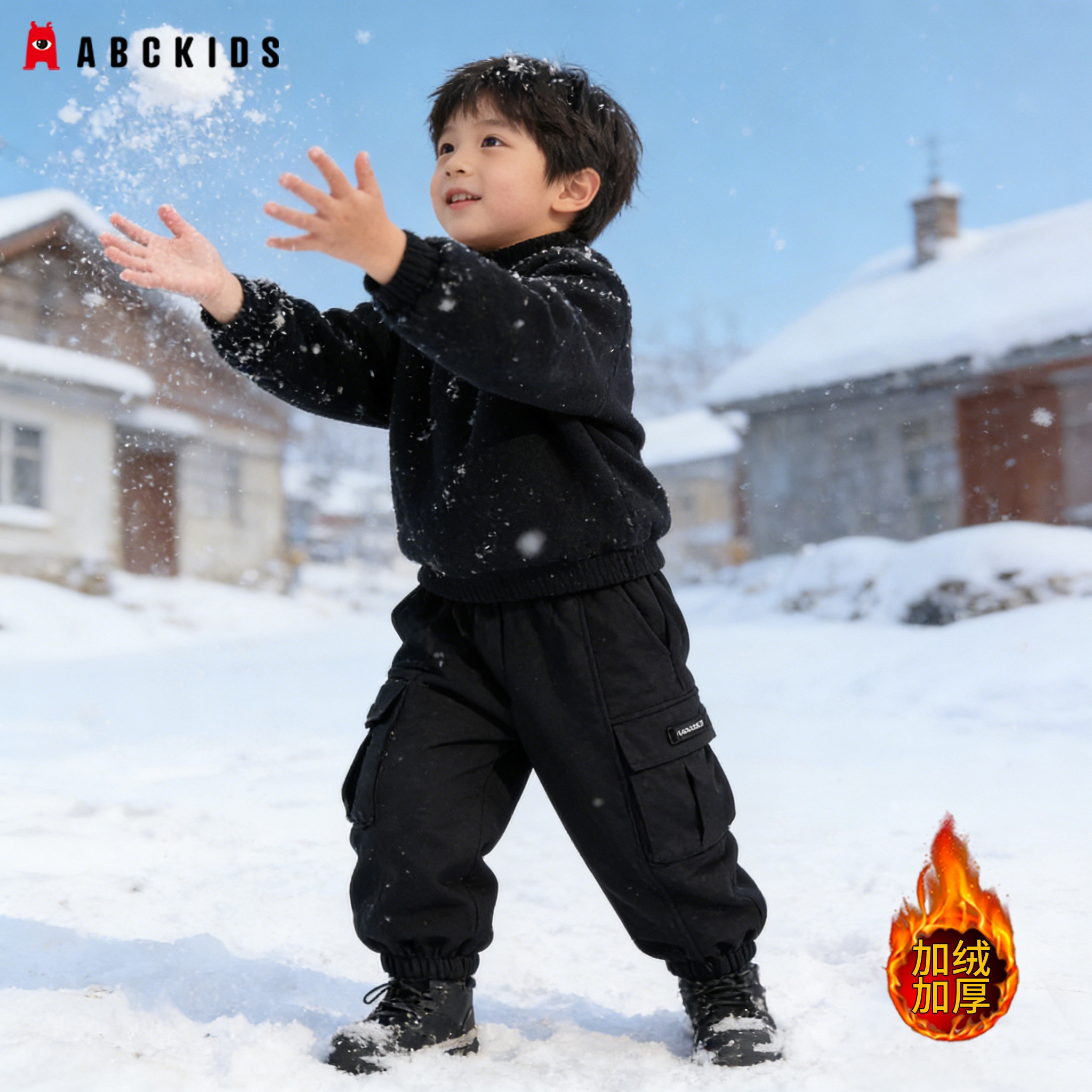abckids童装男童加绒裤子2025冬装新款儿童加厚保暖冬季工装长裤