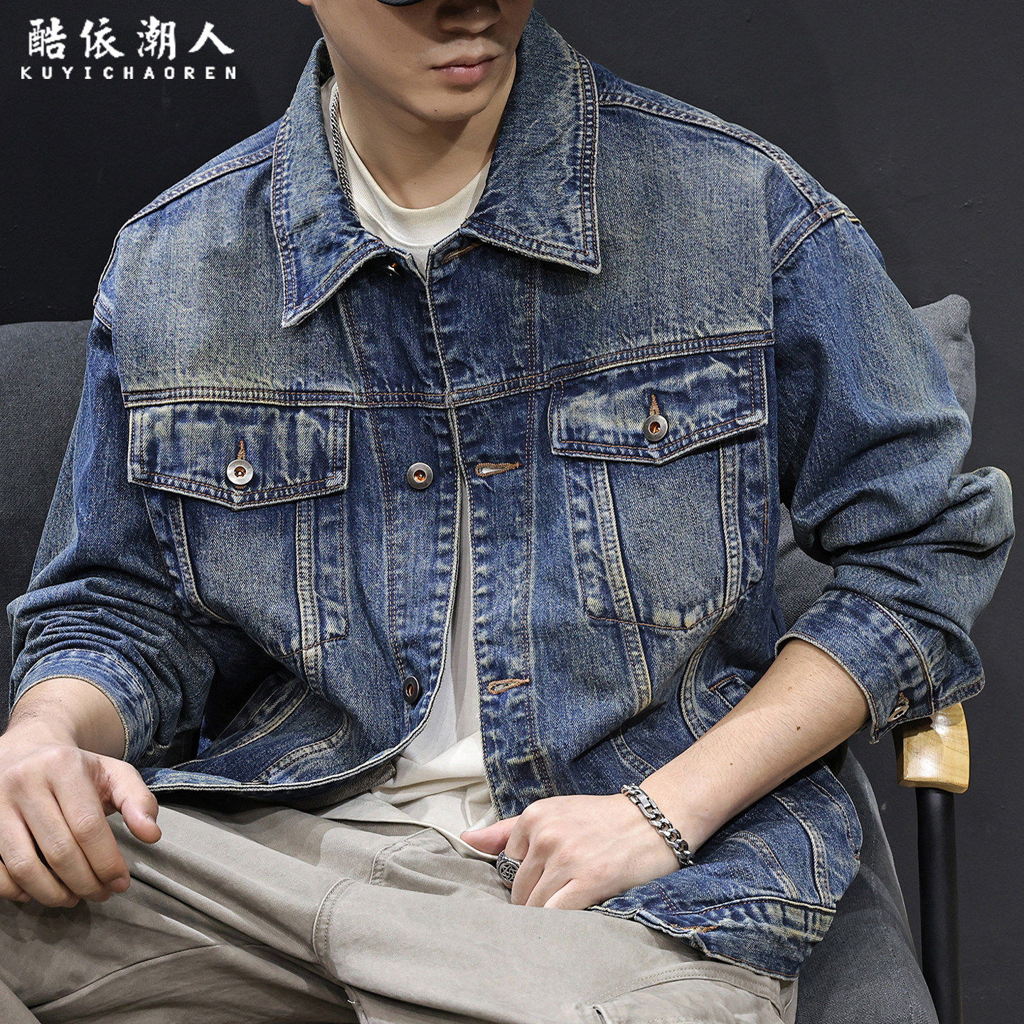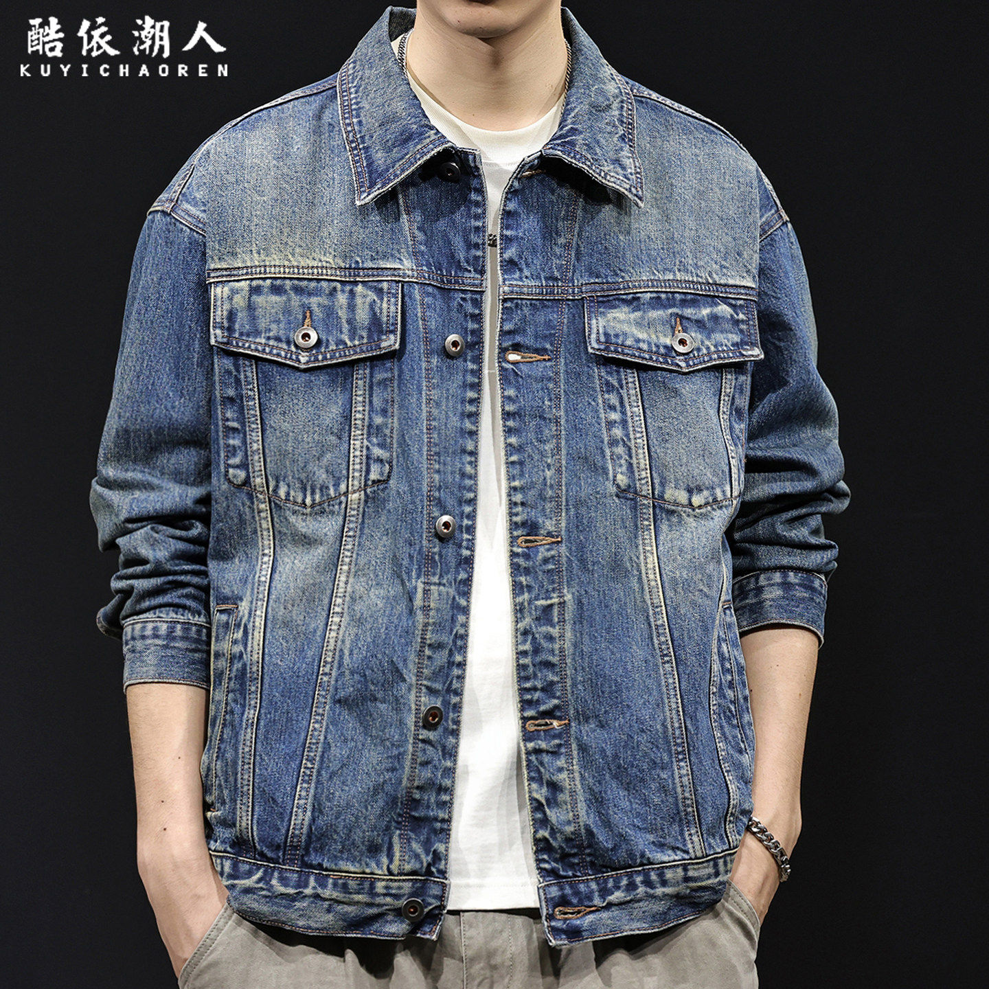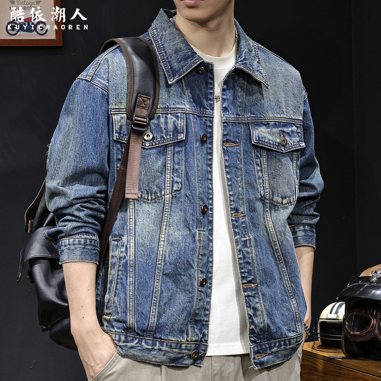 复古怀旧牛仔外套男2026新款春秋季翻领多袋潮牌夹克大尺码