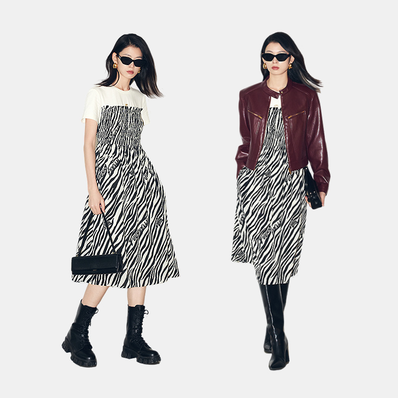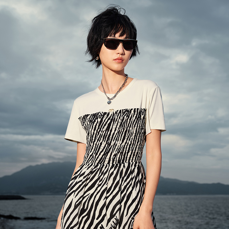 【猫纹系列】FF仿佛连衣裙2025夏新款条纹显瘦印花a字假两件长裙