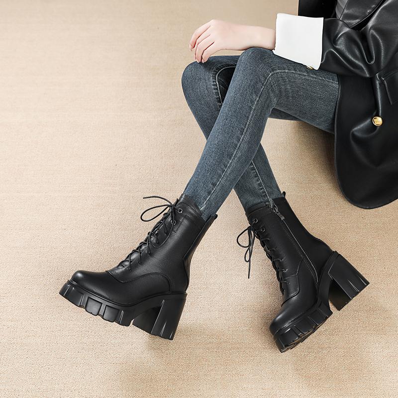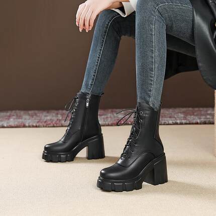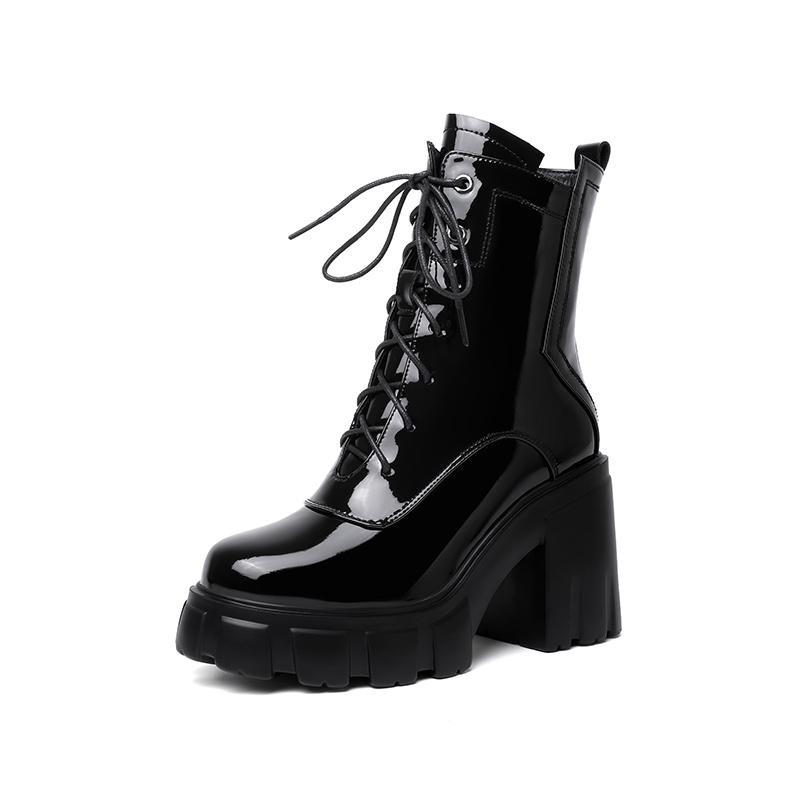 10CM时尚漆皮厚底舒适马丁靴英伦风百搭圆头粗跟系带显瘦小短靴女