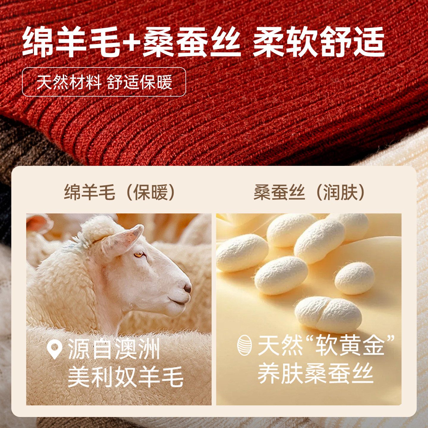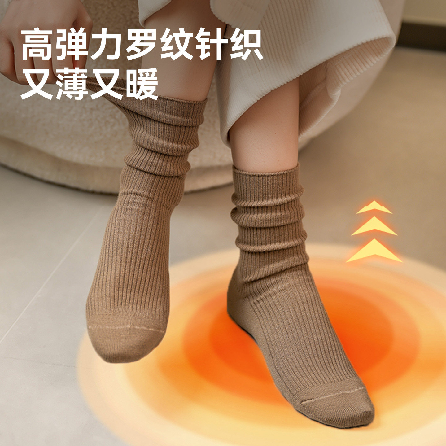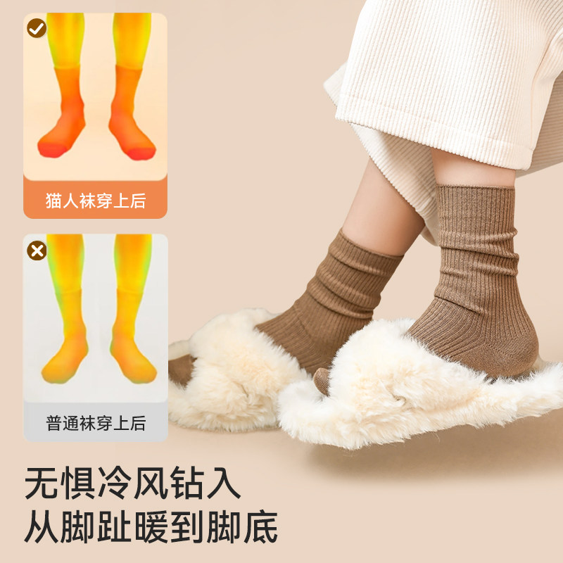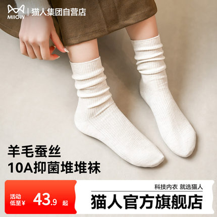 猫人2025新款女士袜子秋冬季中筒袜保暖抗菌纯色羊毛袜女士堆堆袜