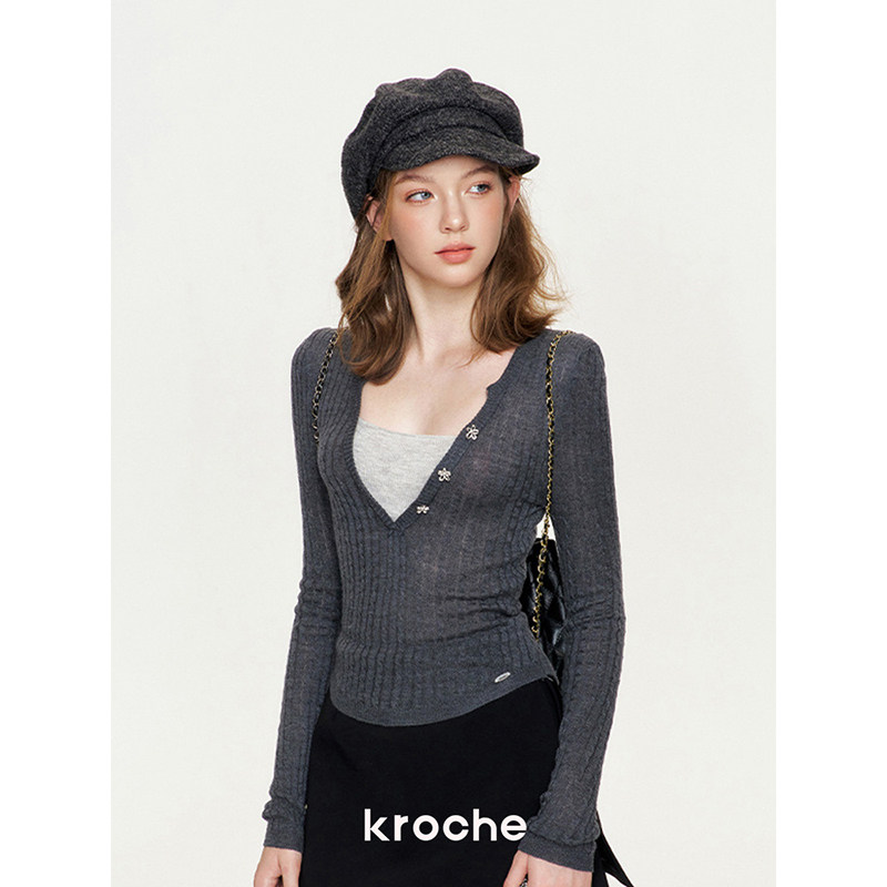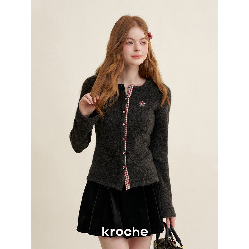 Kroche knowledge 丝绒拼接双腰头蝴蝶结百褶半裙