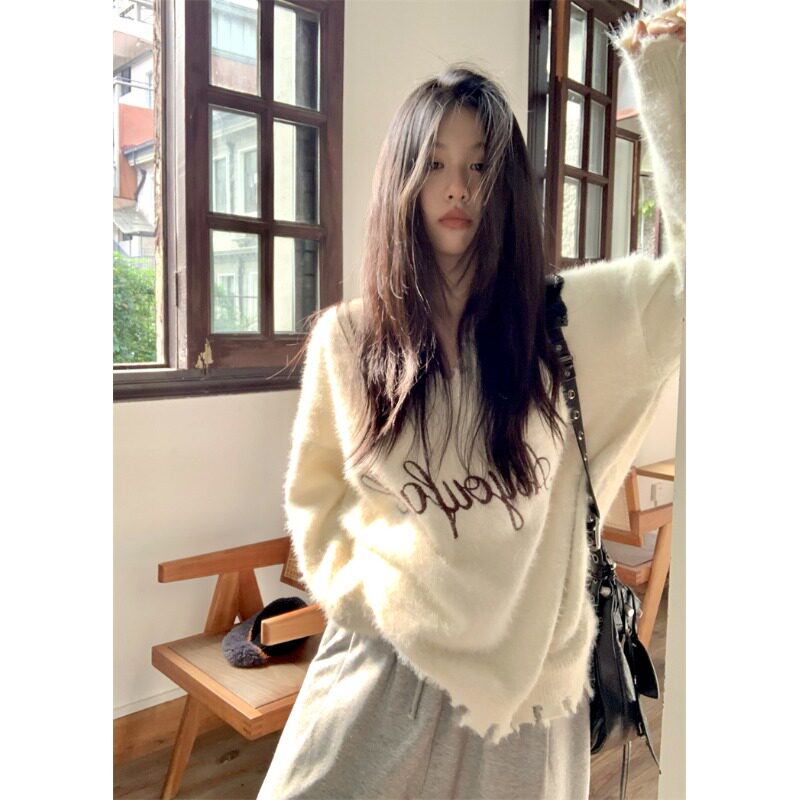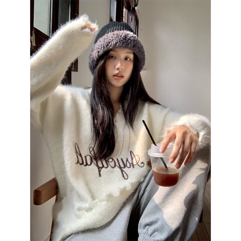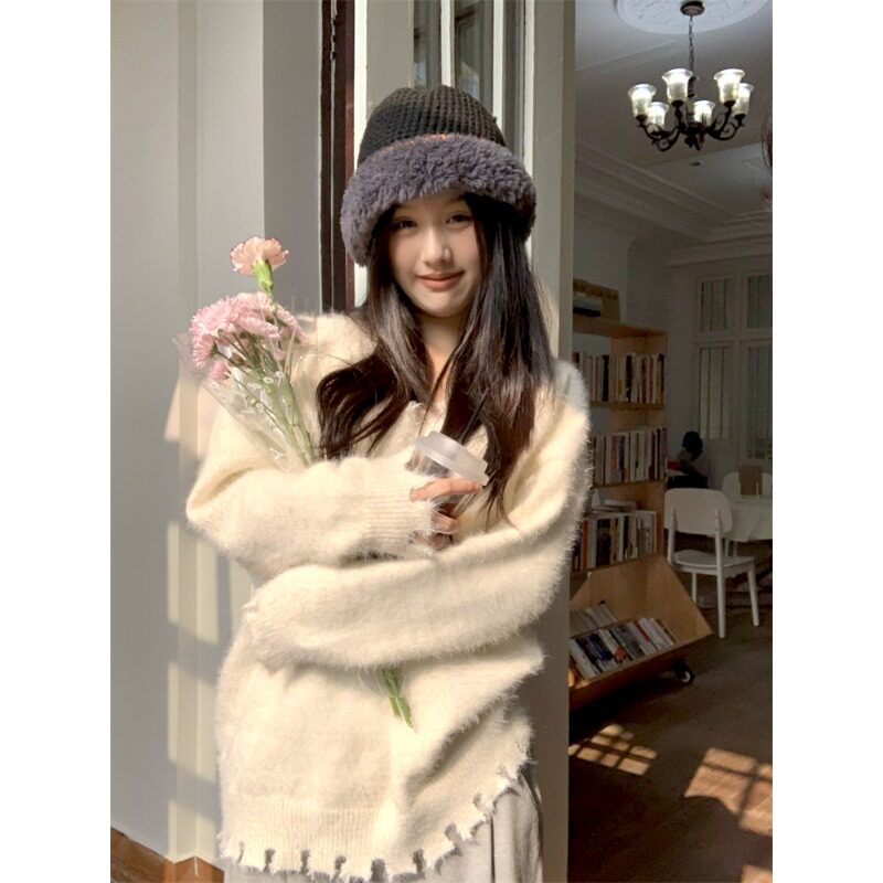 毛茸茸软糯V领毛衣女2025新款秋冬季韩系慵懒风宽松针织衫上衣