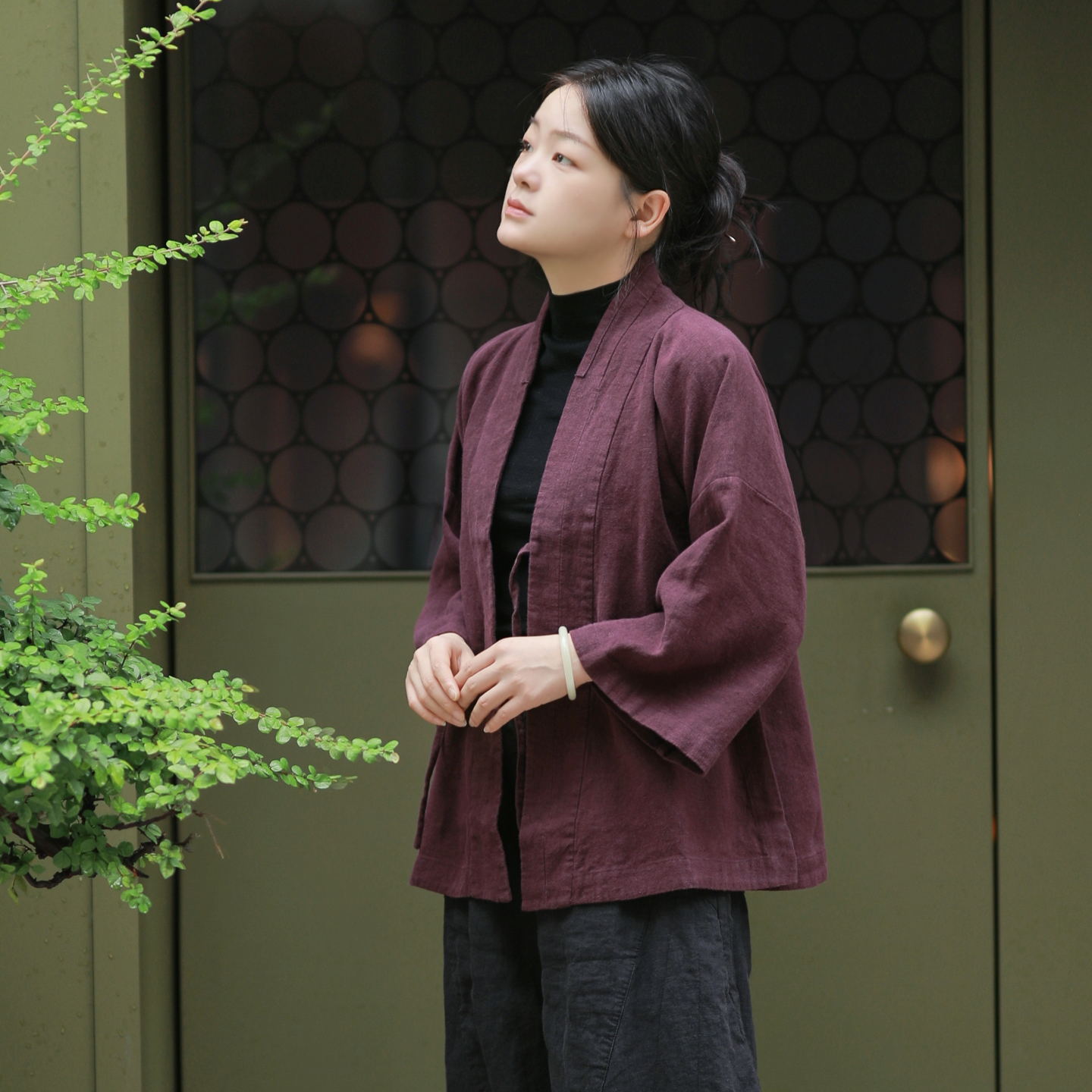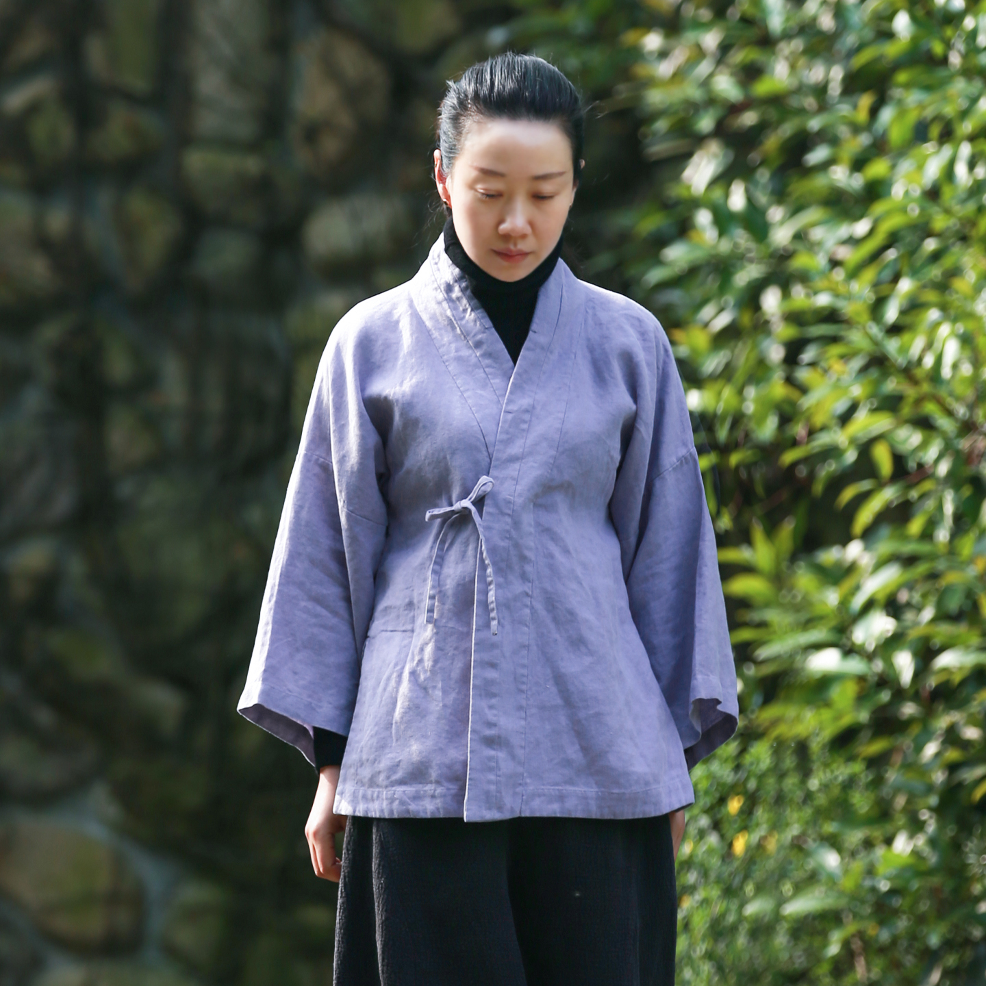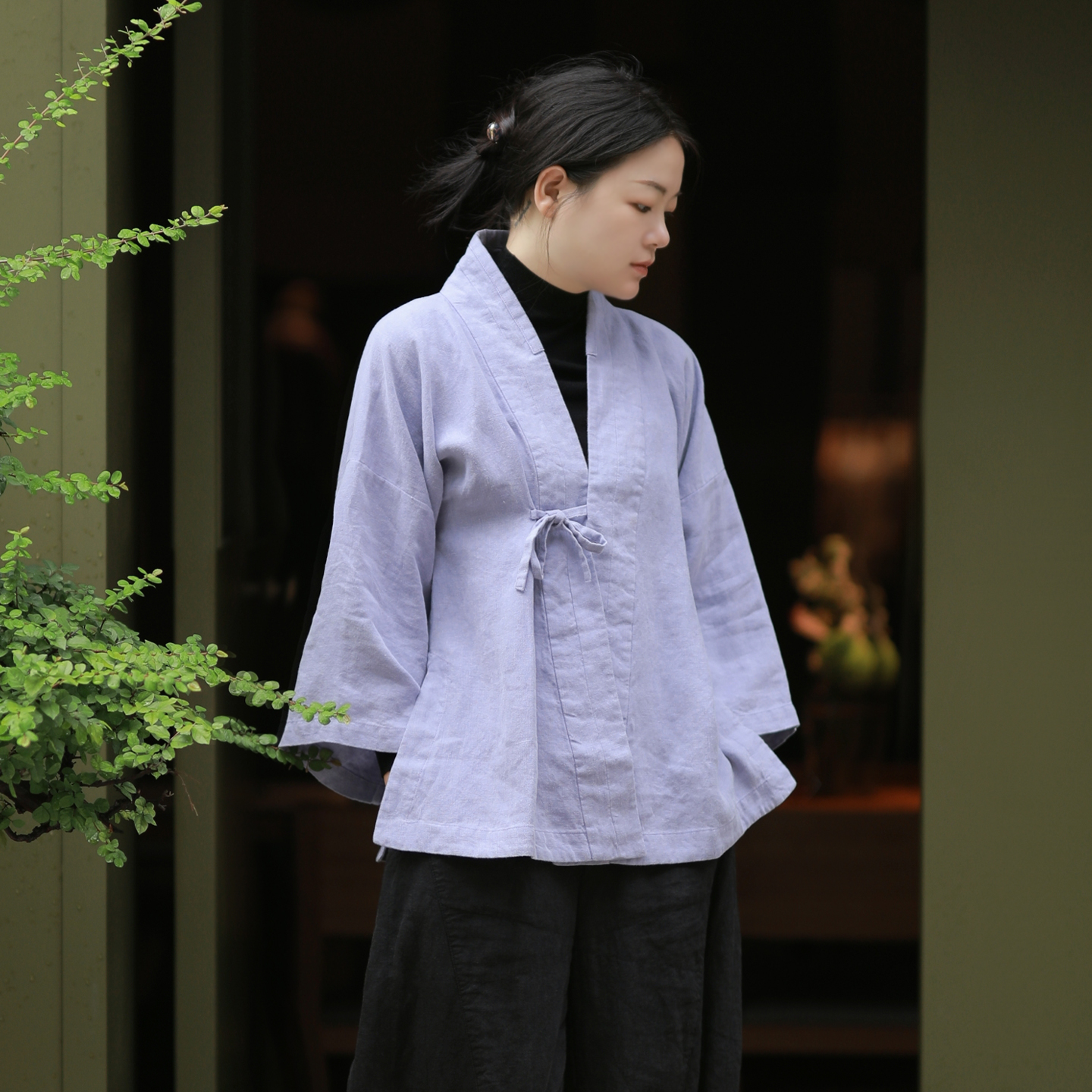 古石后中式斜襟系带亚麻衬衫外套