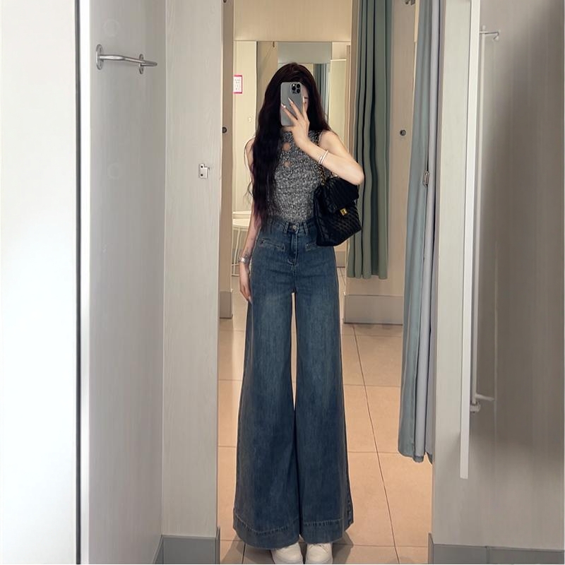 李李服饰高级感蓝色阔腿牛仔裤女2025秋季新款高腰遮肉显瘦拖地裤